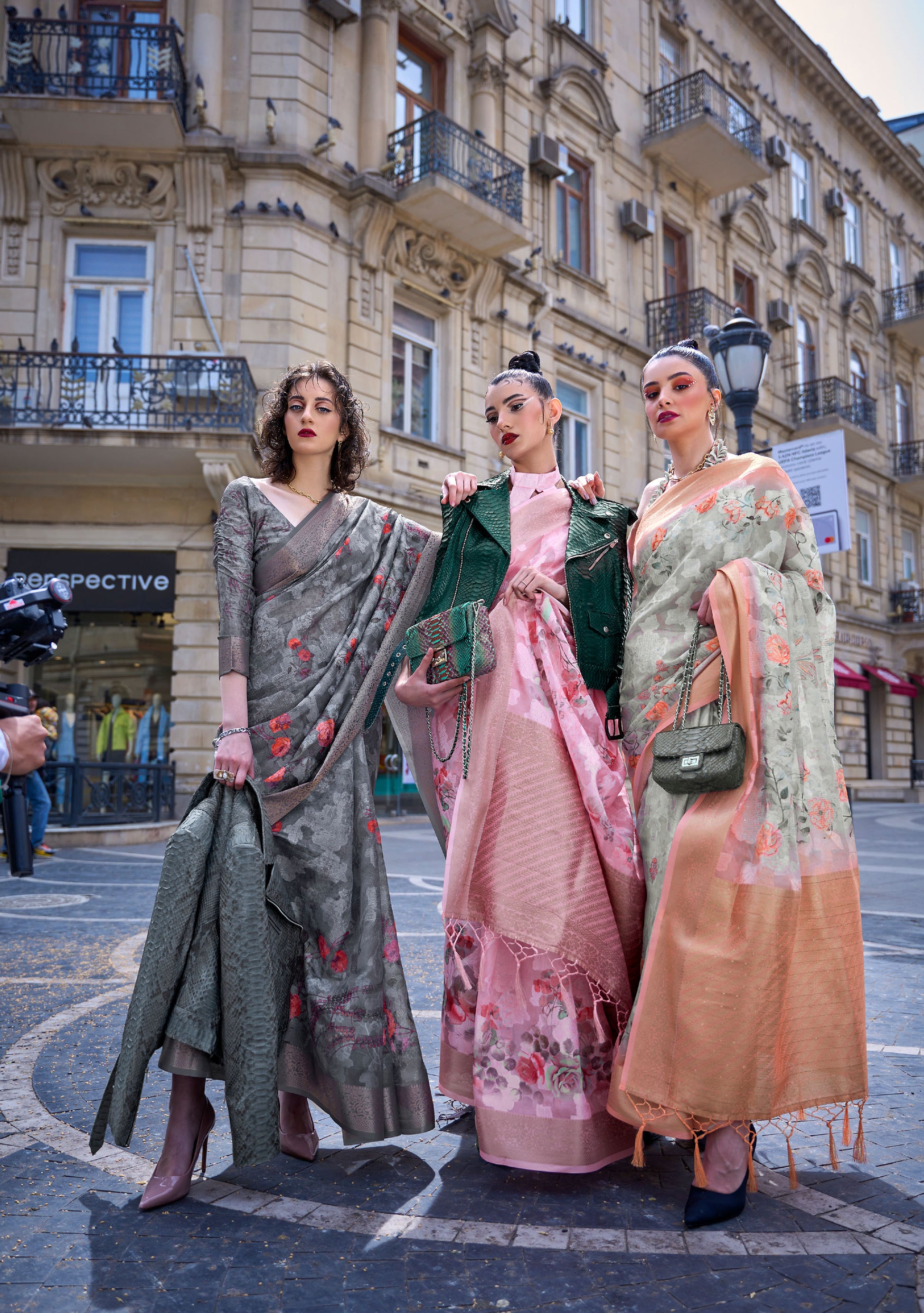 Dark Grey Floral Kinsel Printed Poly Handloom Saree