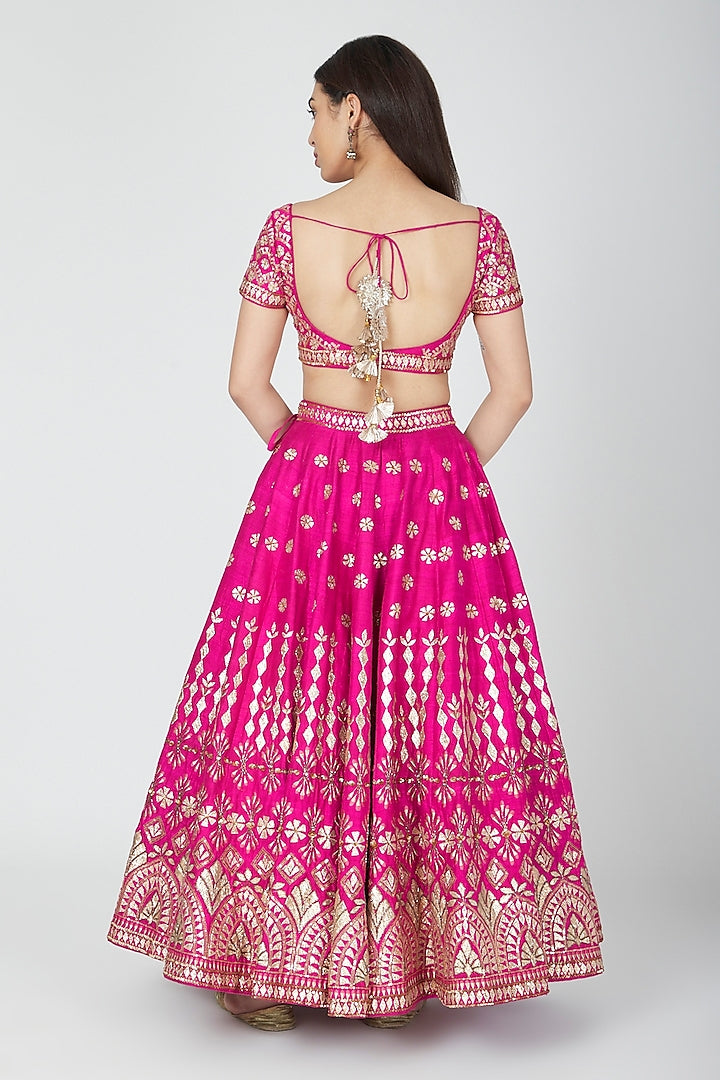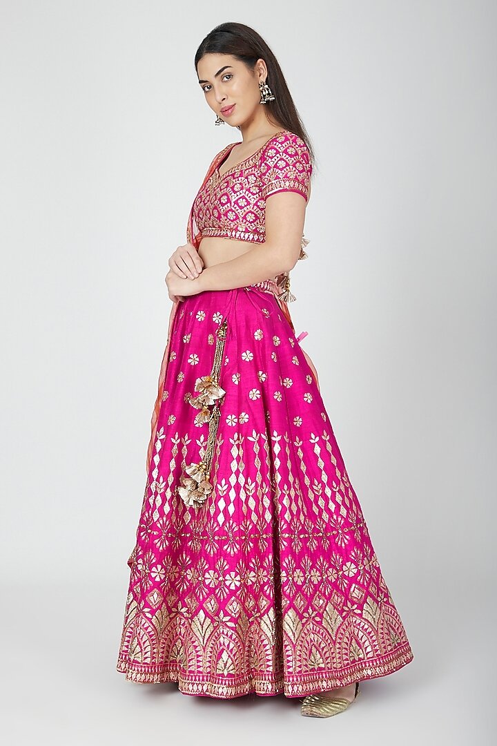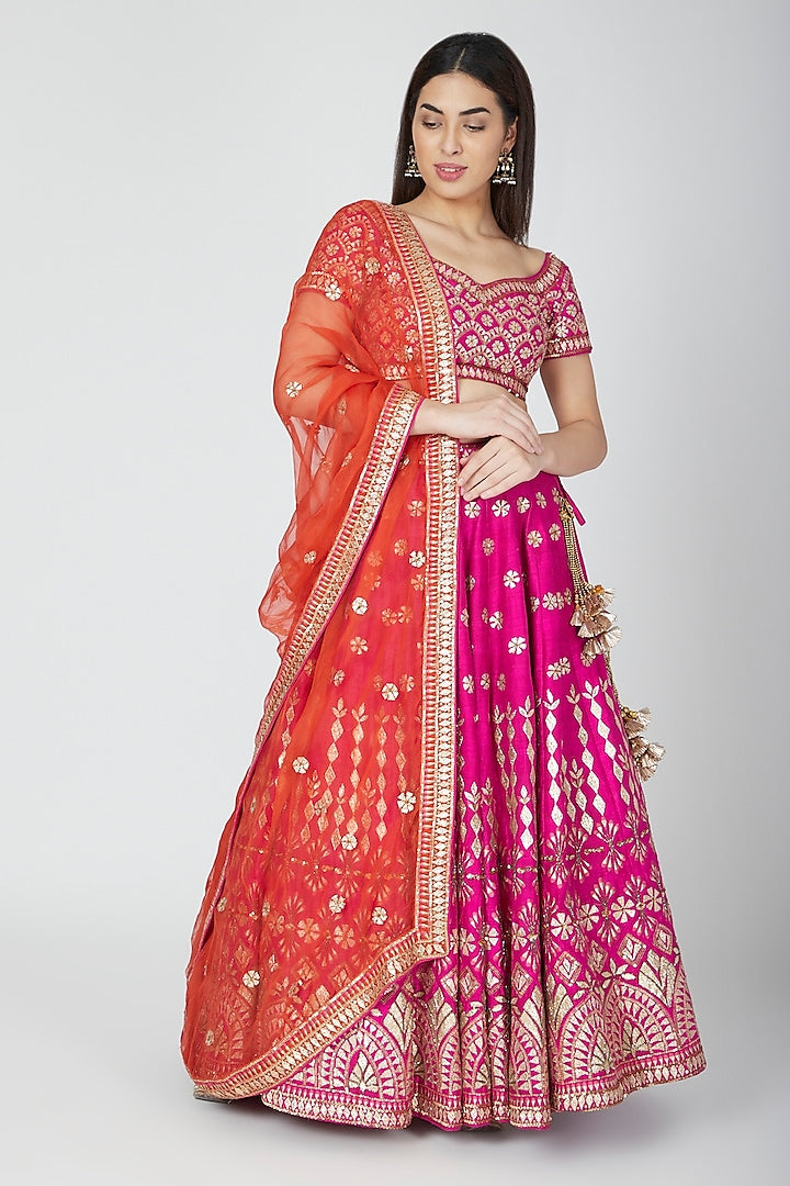 Looking for an outfit that will leave everyone in awe of your fashion sense? Our Dark Pink and Orange Color Raw Silk Sequins Work Lehenga Set is just what you need! Designed with a blend of comfort, style, and elegance, this lehenga will be the envy of all. Featuring a fuchsia lehenga in raw silk base with gota and sequins embellishments. It is paired with a matching blouse and orange dupatta in organza base.