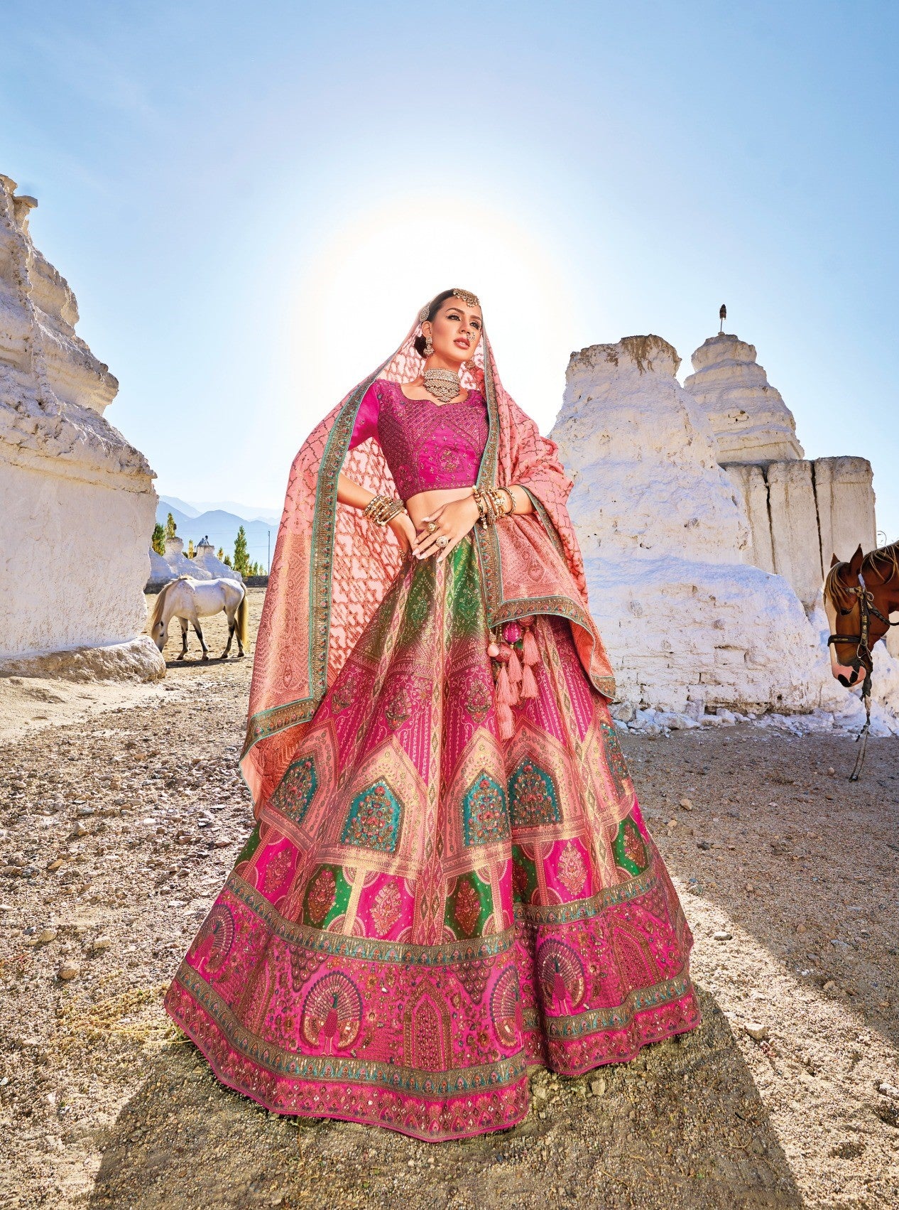 Dark Pink and Peach Color Sequins Embroidered Banaras Silk Bridal Lehenga