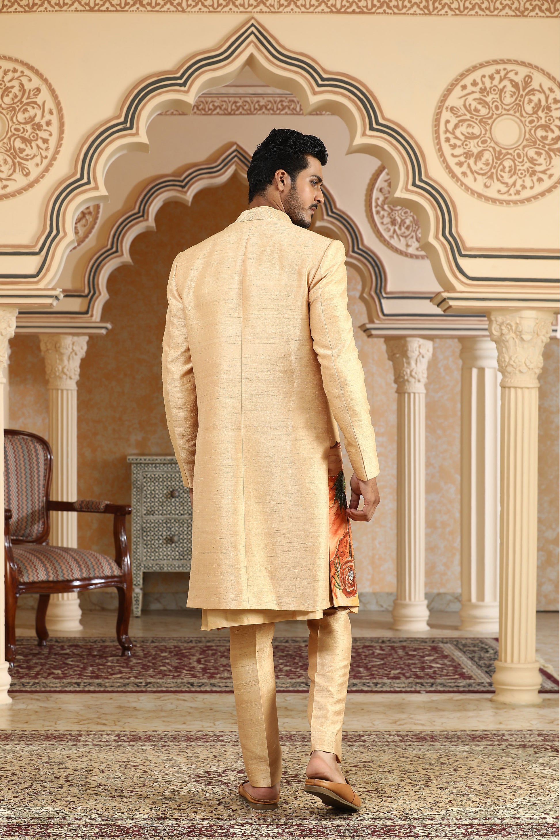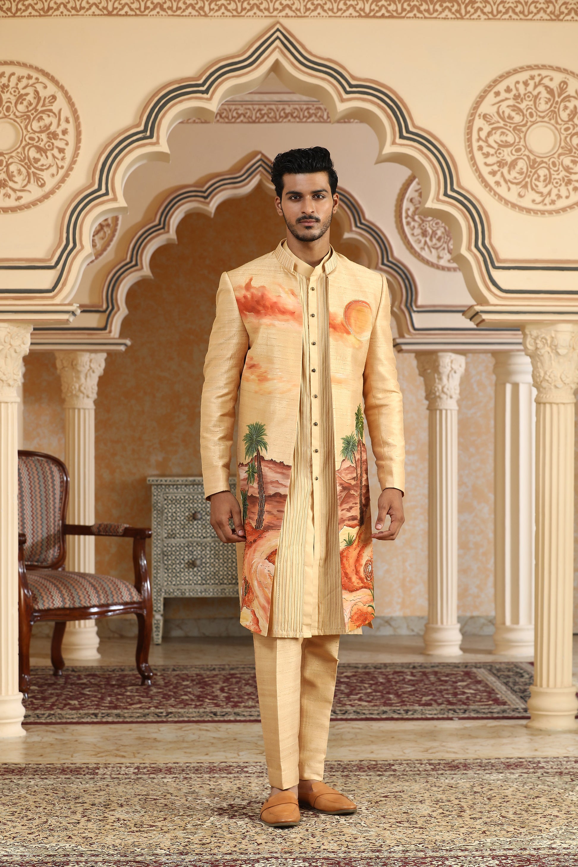 Evoking the mystique of shifting sands and sunlit dunes, this yellow open jacket set is a canvas of artisanal brilliance. Crafted in a luxurious blend of raw silk and chanderi silk, the jacket features intricate hand-painted motifs layered with delicate badla, zari, and sequin embroidery that shimmer like heat waves in the desert. The open-front silhouette is paired with a coordinating kurta and pants, offering a perfect harmony of tradition and contemporary design. Ideal for sundowner weddings and art-inspired festivities, this piece is a wearable painting that commands attention.