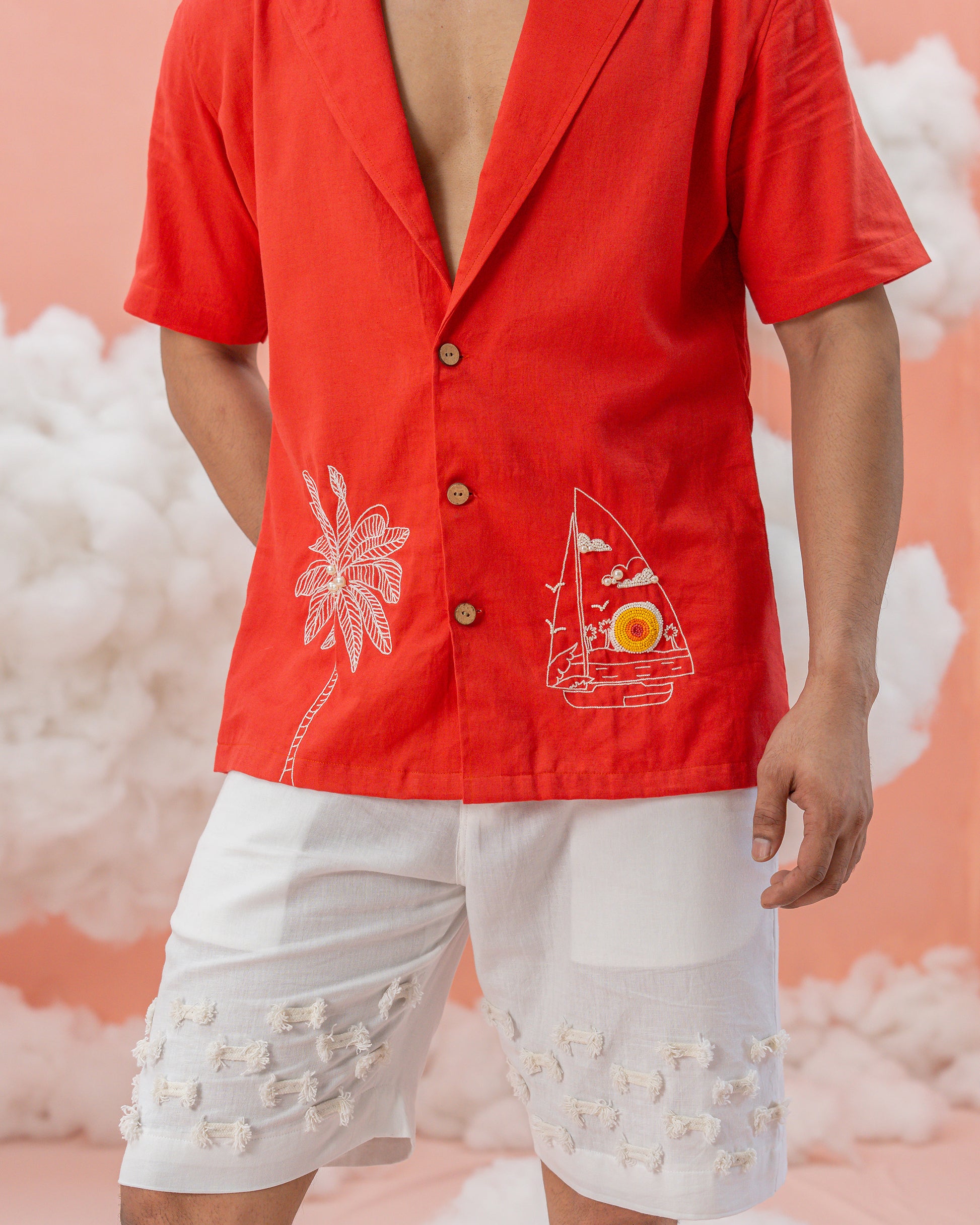 These Linen Cotton shorts feature a Dori detailing along the hemline, resembling the look of a brick wall. The rope accents create a dynamic texture, adding a touch of originality to the garment. Perfect for easy-going summer days, these shorts offer both comfort and a distinctive edge.