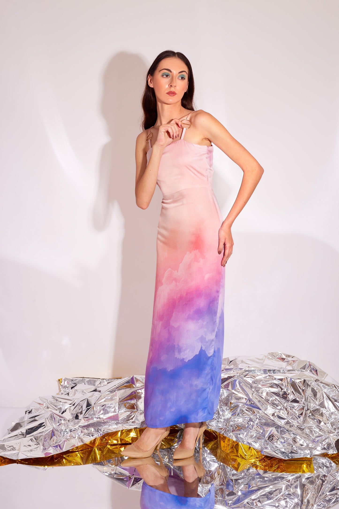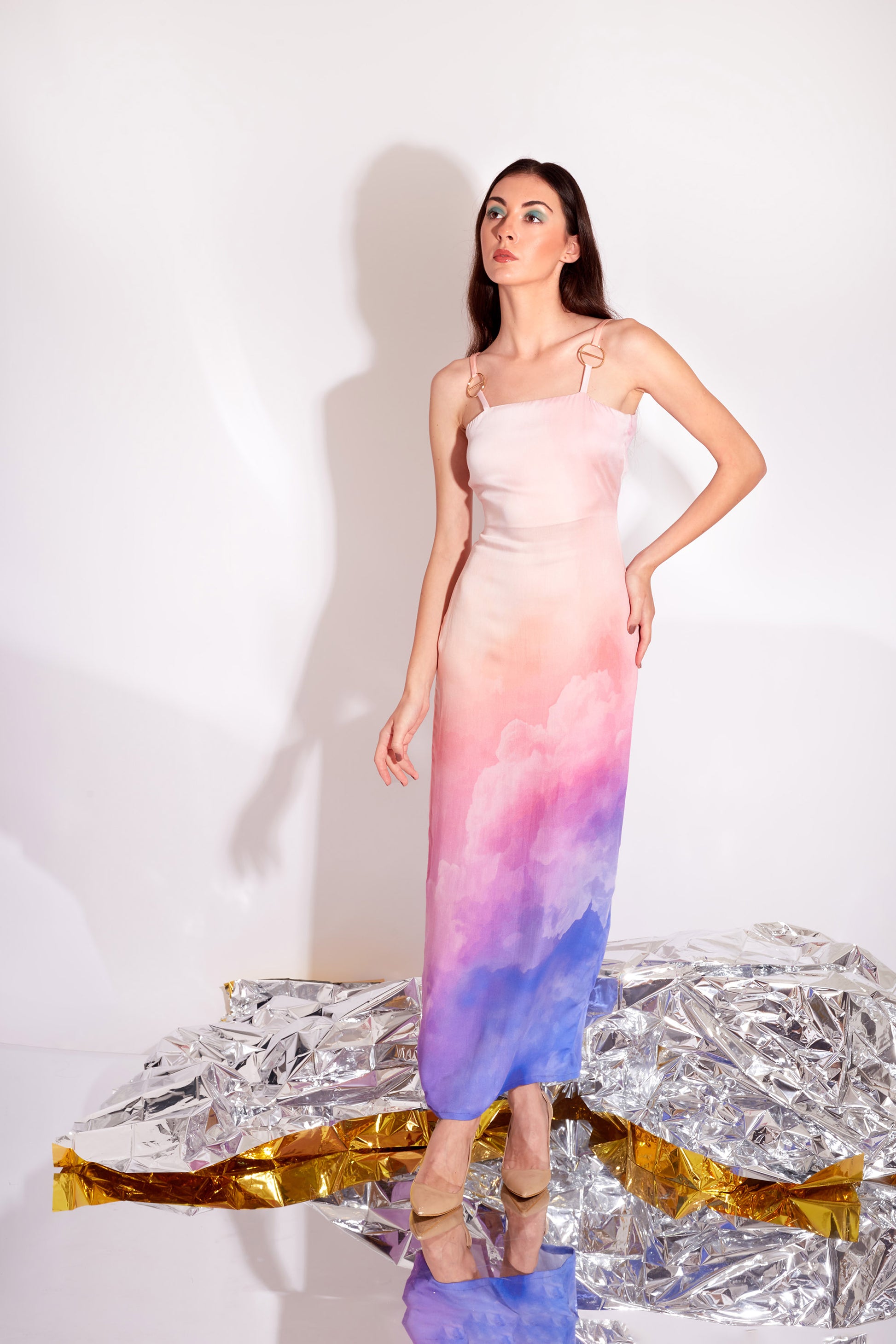 A fitted psychedelic cloud printed midi dress with buckle straps. Comes with a back zipper closure