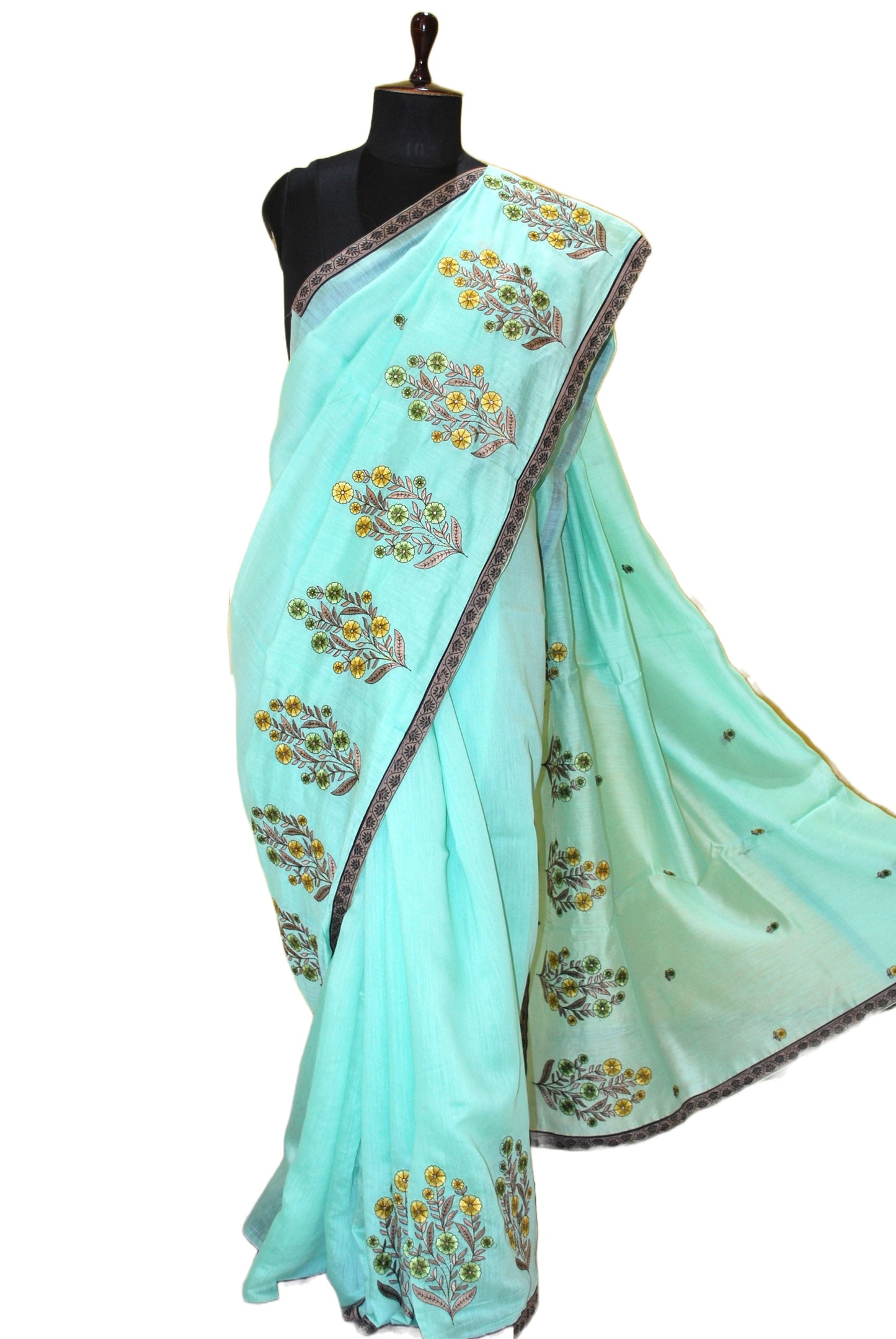 Embroidery Work Semi Georgette Saree in Seafoam Green, Black And Multicolored