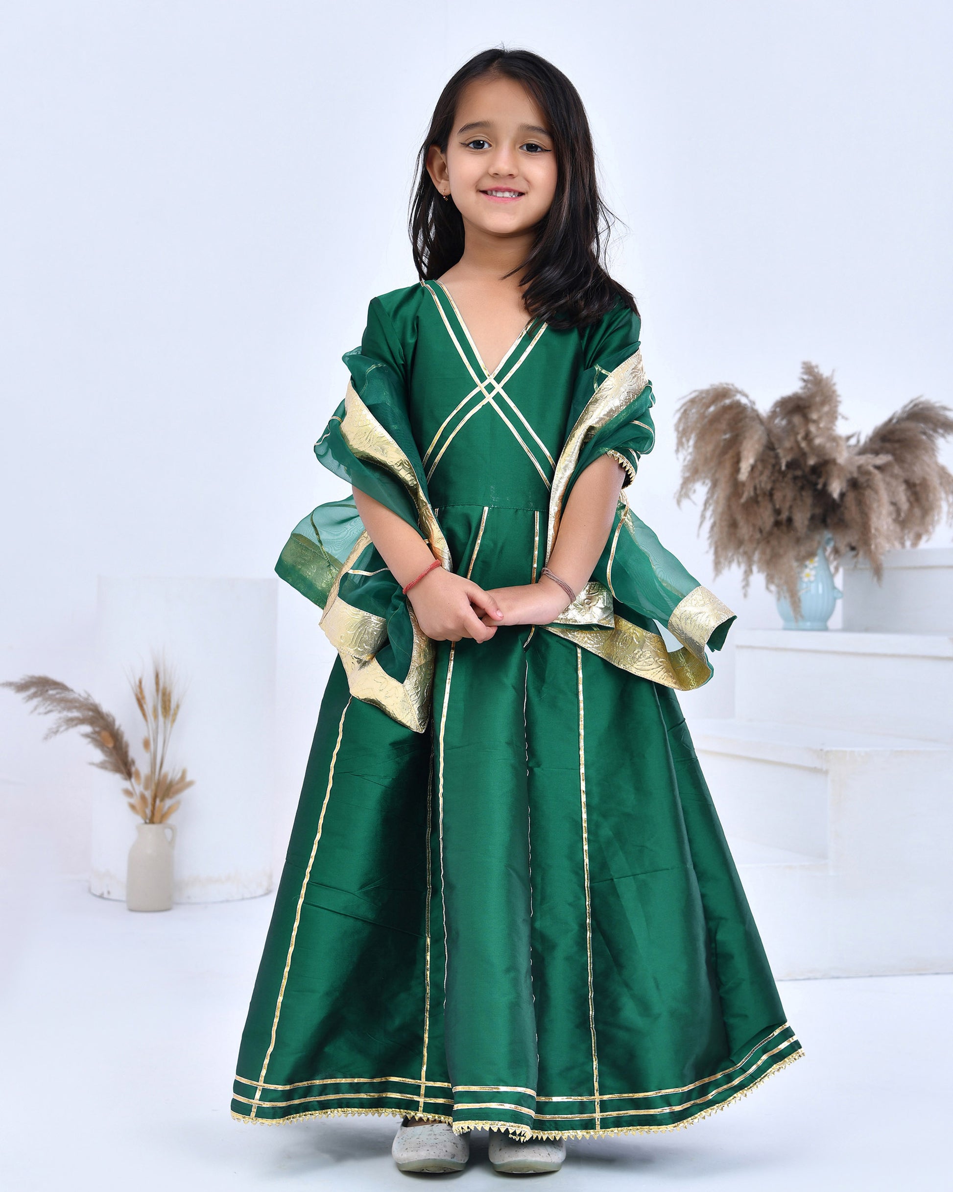 Featuring emerald green, gota embellished, floor-length anarkali in taffeta silk fabric. It's paired with a gota embellished organza dupatta.