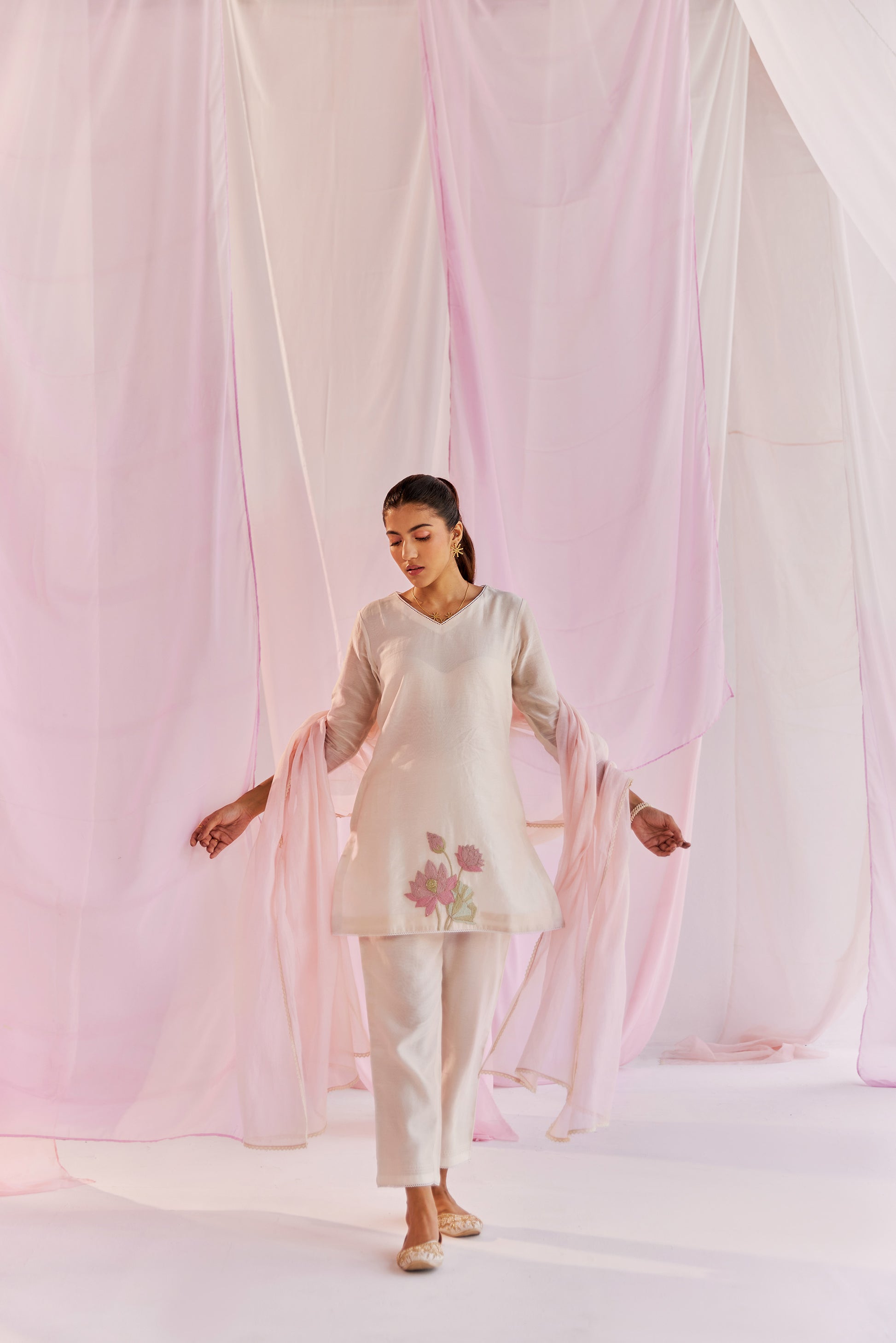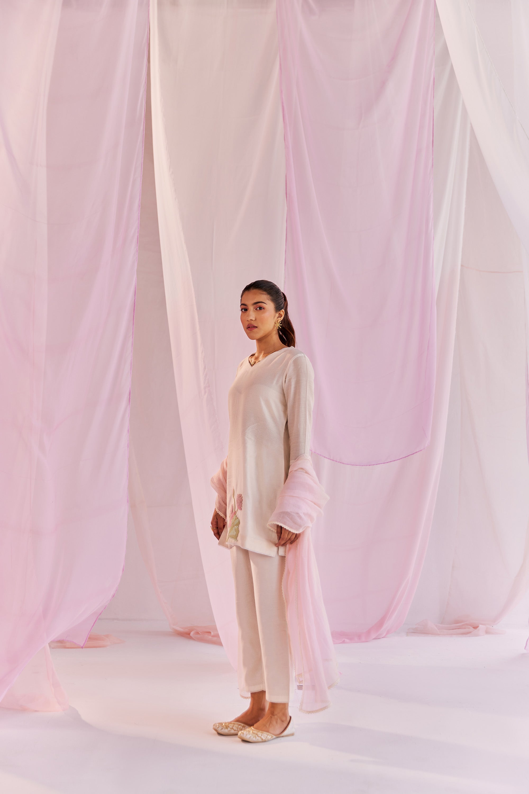 ENYA KURTA SET - Featuring an Ivory V-neck kurta in silk chanderi base with dori work motif. It is paired with matching chanderi pants and a silk chanderi dupatta.