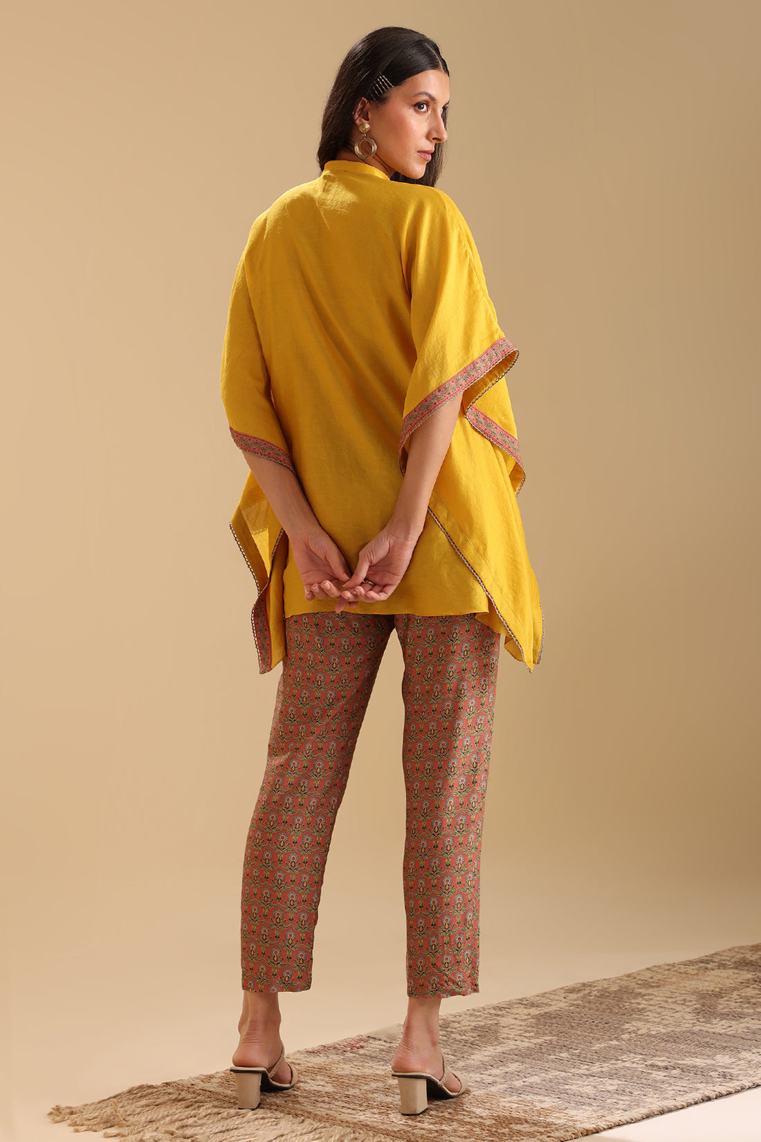 Yellow Eraya embellished Chanderi short kaftan shirt with Chanderi pants.