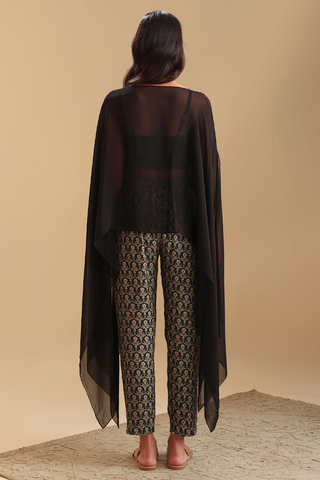 Black Eraya Sleeveless Bustier And Printed Pants in Muslin Slub Paired With Asymmetric Embellished Cape in Organza.