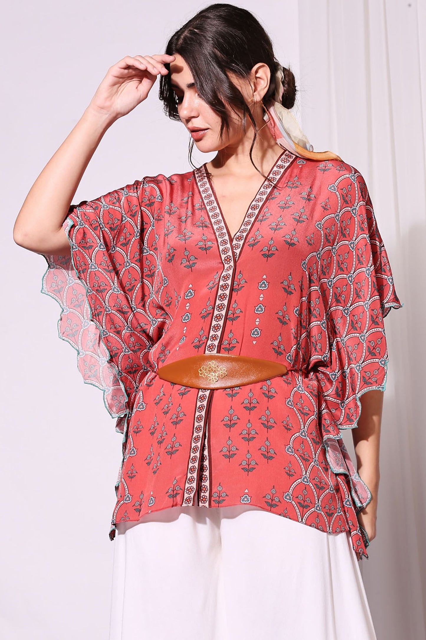 Ethnic Blush Red Floral Printed Kaftaan Top And Pants