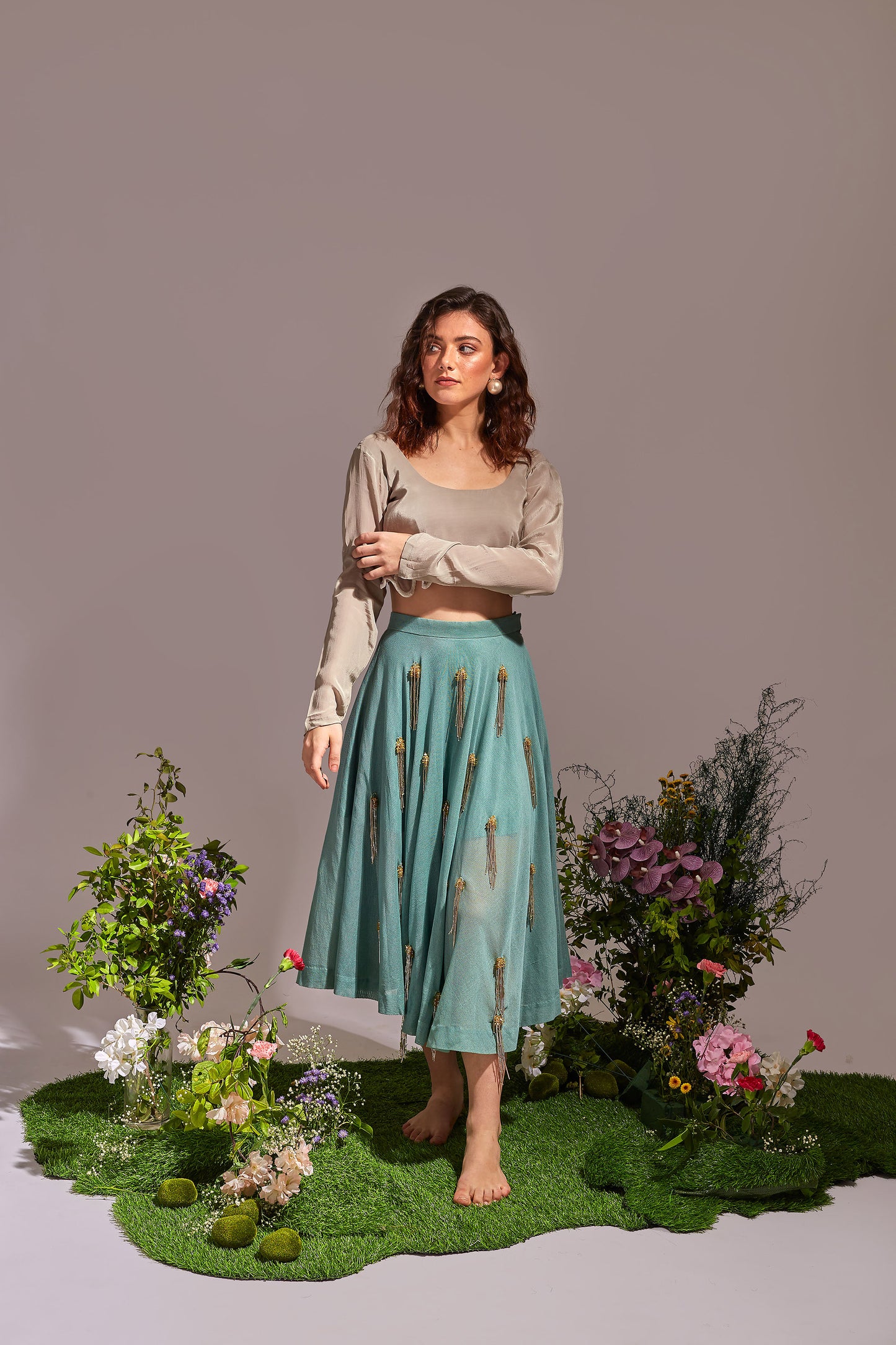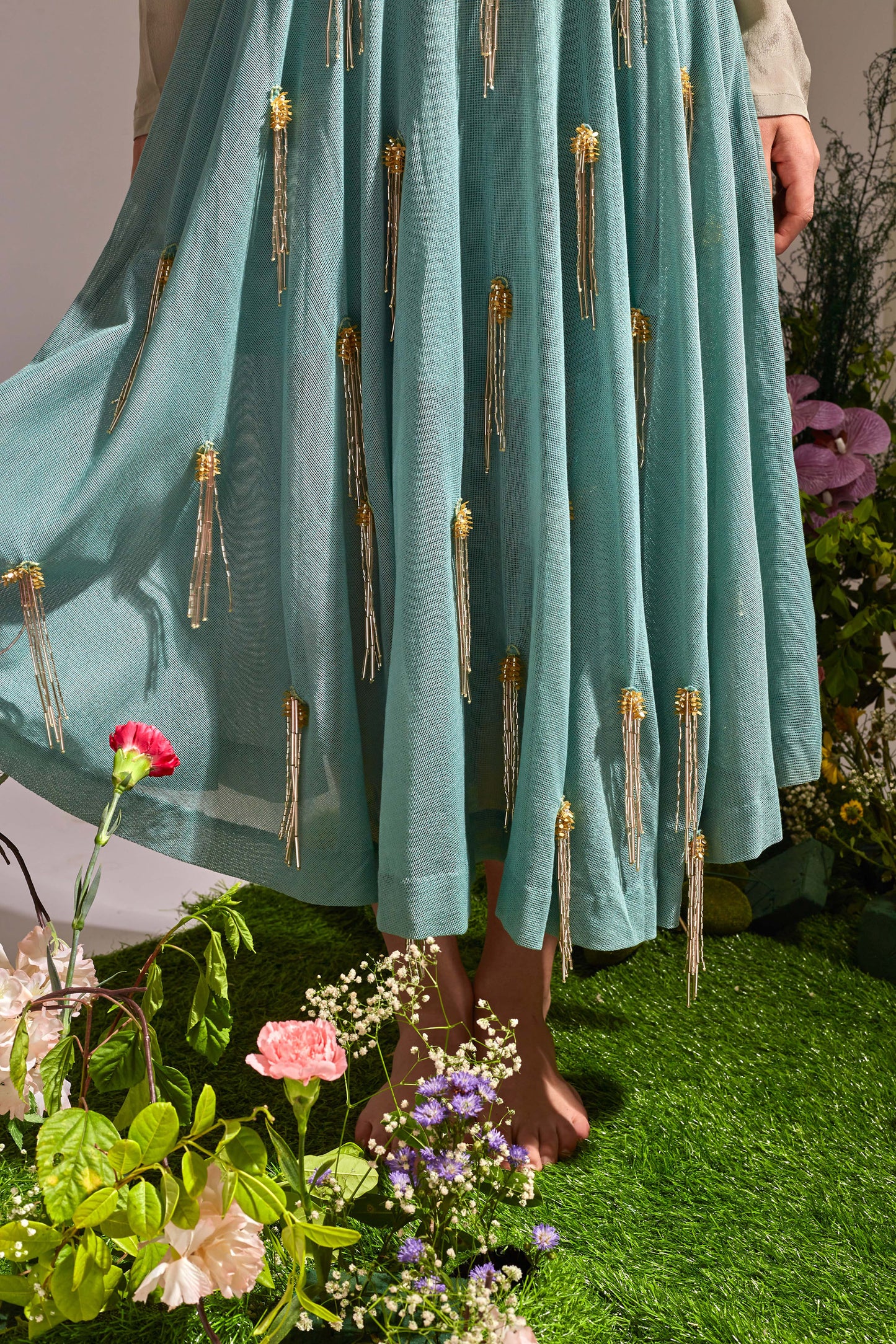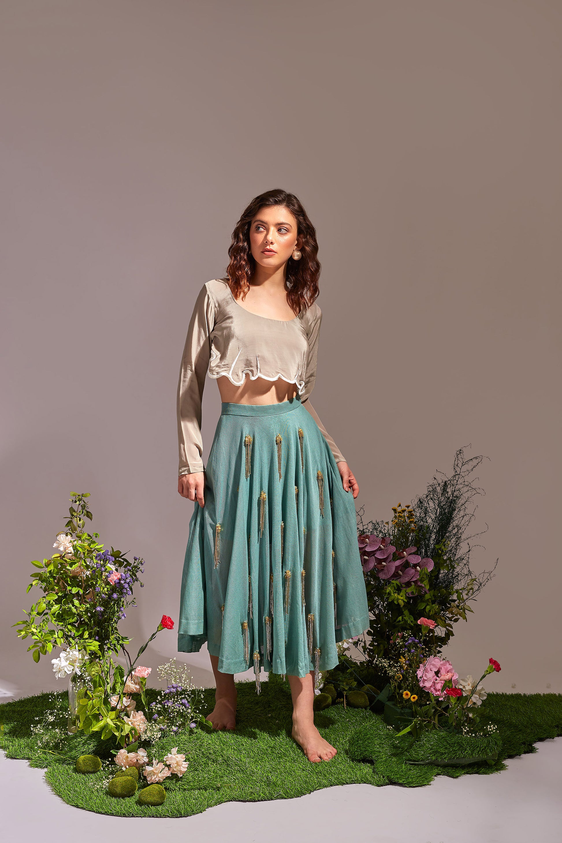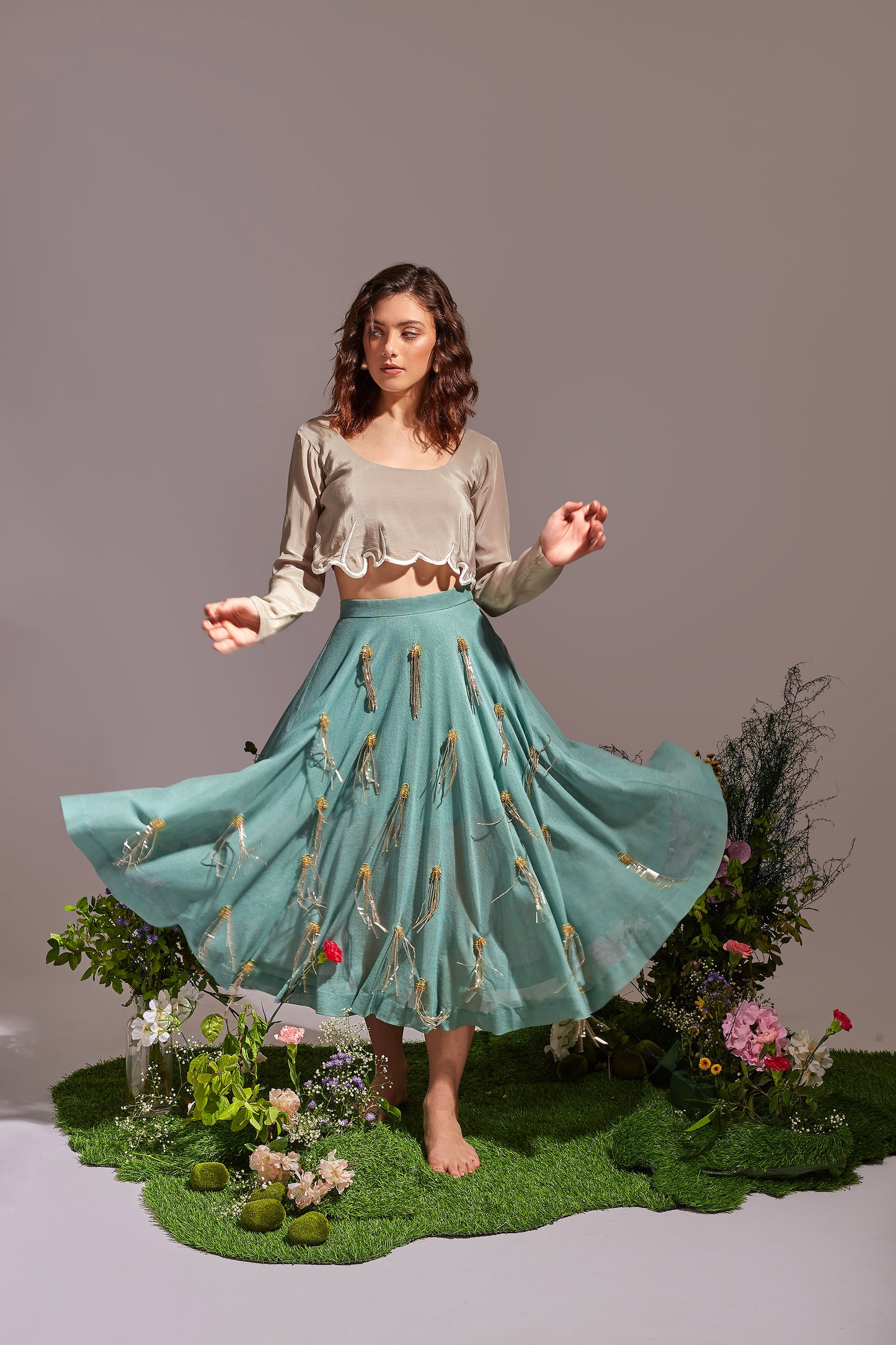 A stunning mesh statement skirt adorned with 3D floral tassels, beautifully paired with a floral scallop-cut top. A must-have ensemble for those seeking a touch of elegance and flair.