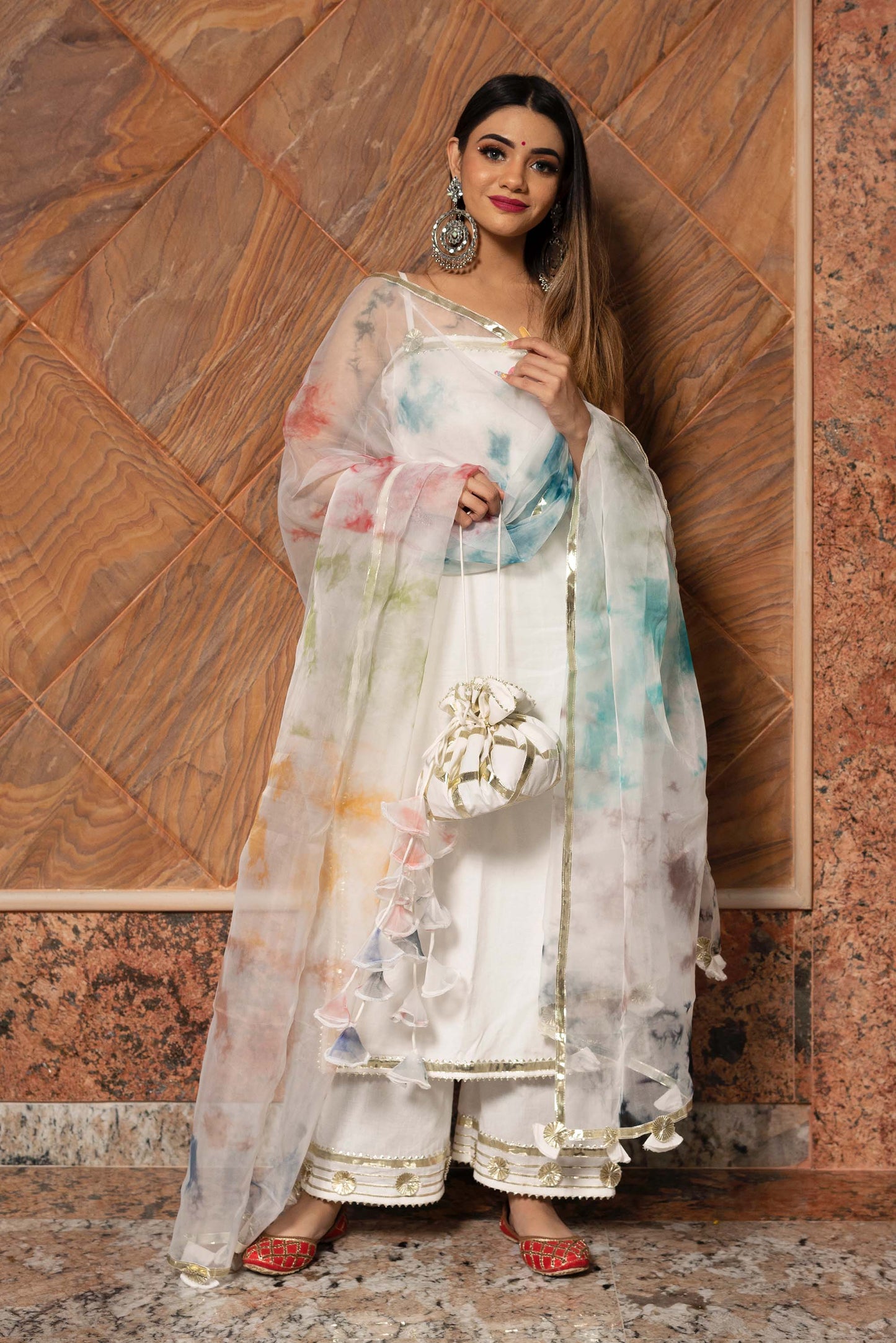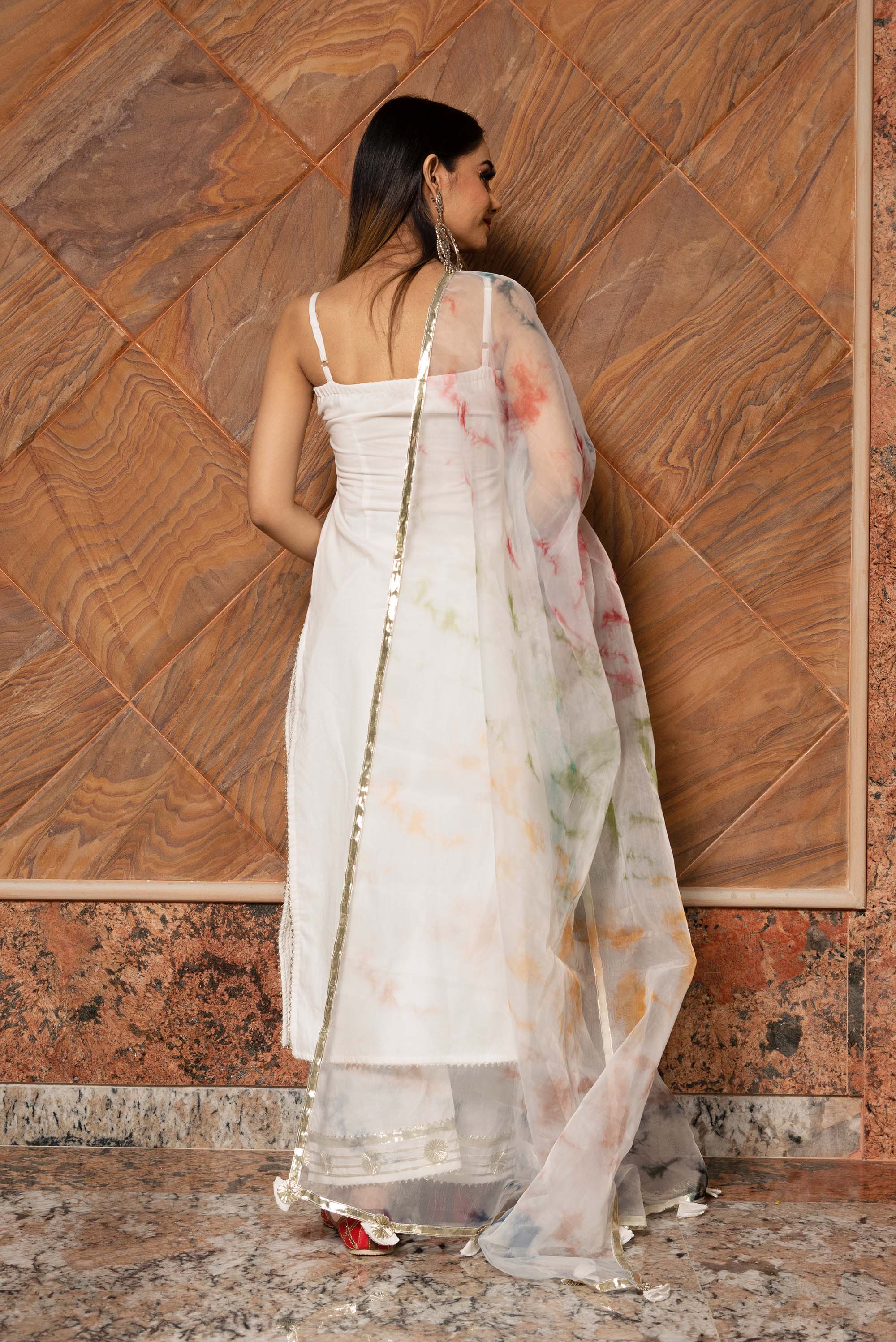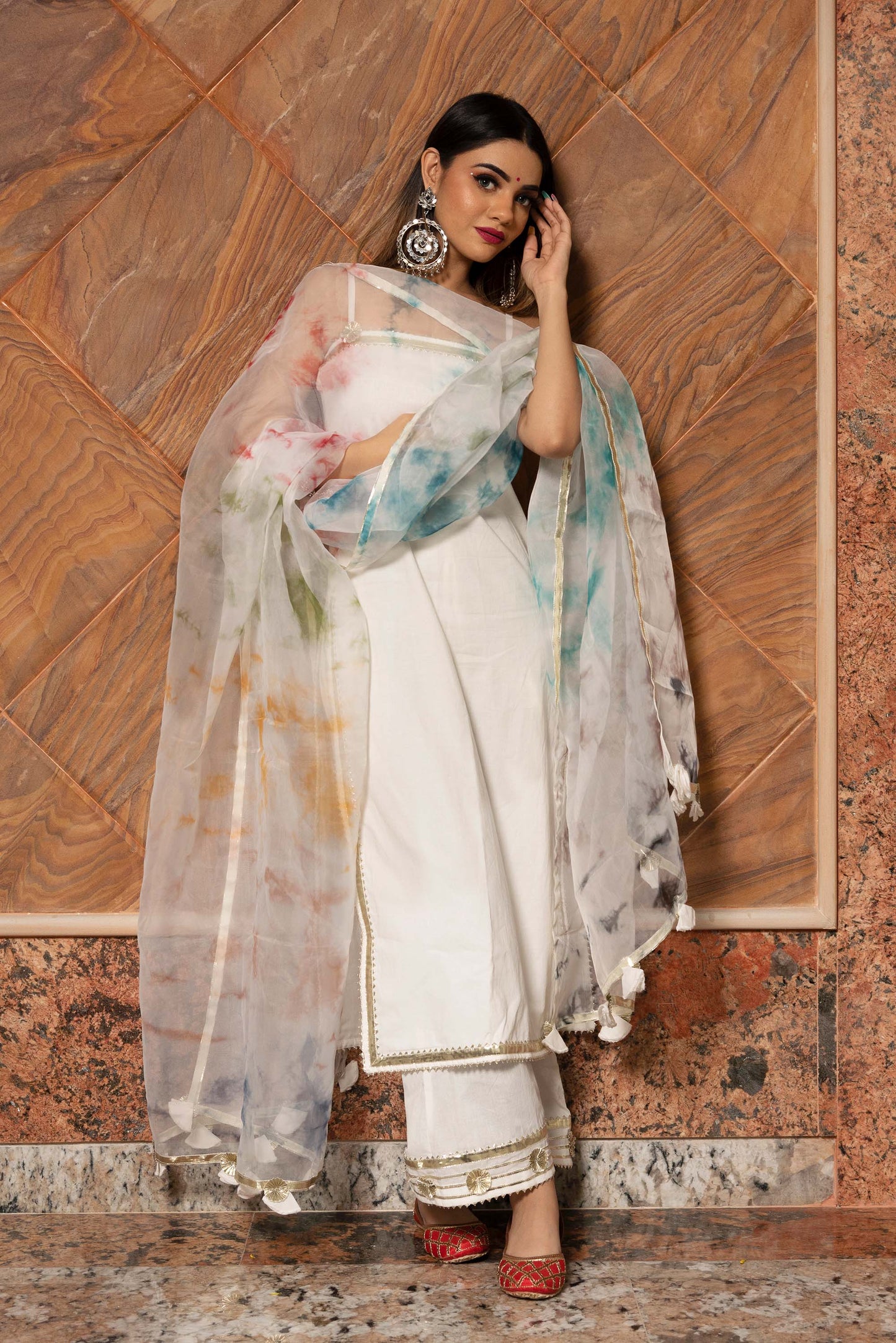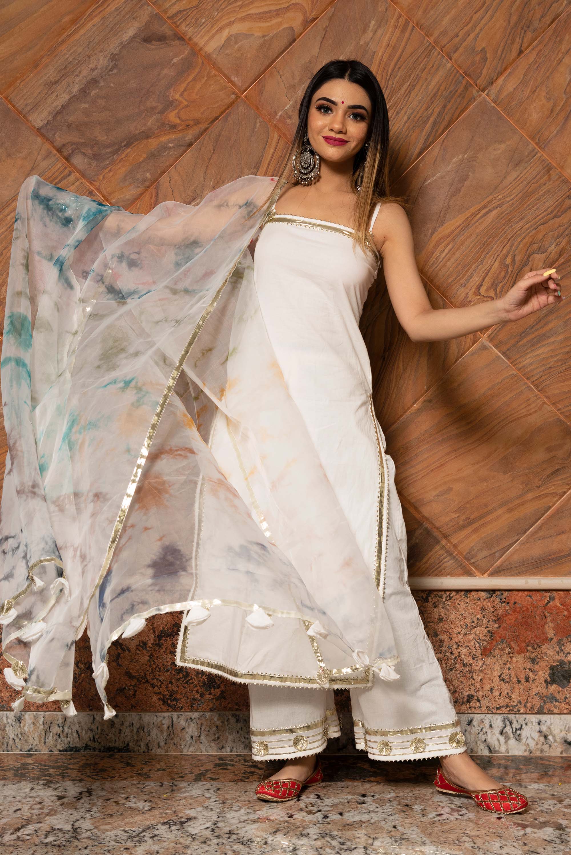Make an everlasting, eternal impression at any upcoming festive occasion in this white cotton suit set with beautiful multi color dupatta comparising with beautiful gotta lace boarder.The suit set features an overall gotta patti lace work,The multi color organza dupatta comes with an gotta lace border and tassel detailing around the edges. This is a great pick for the festive season!