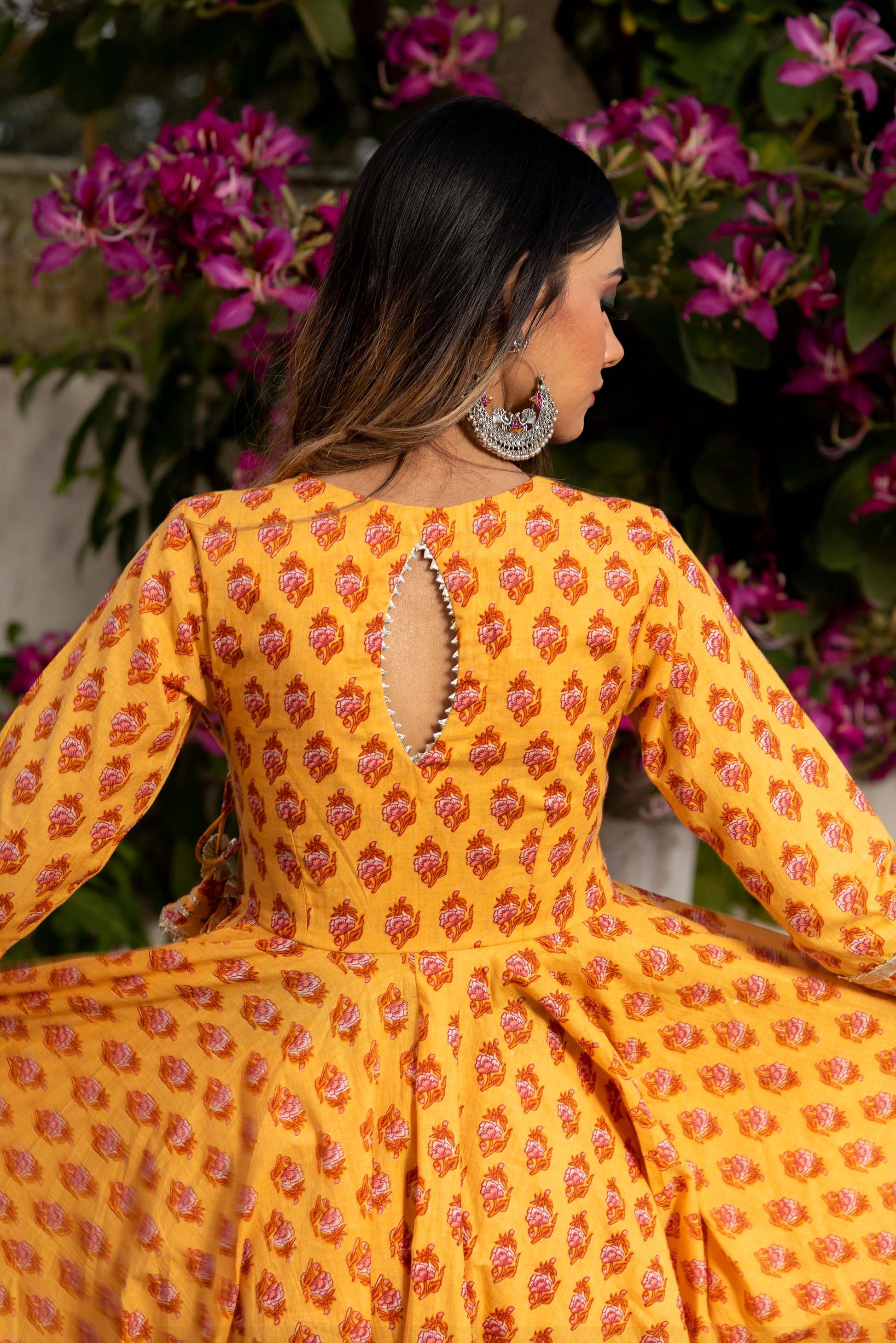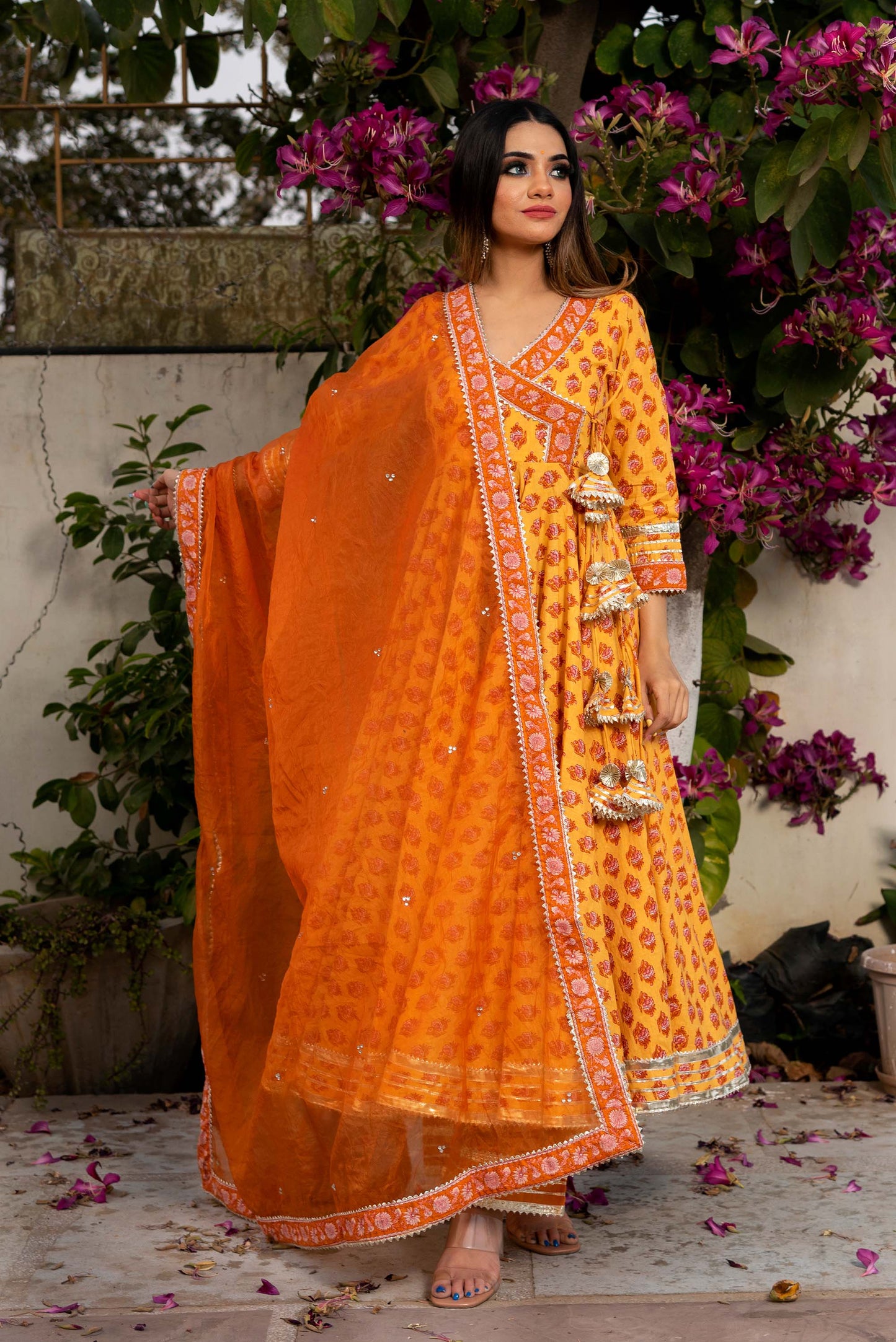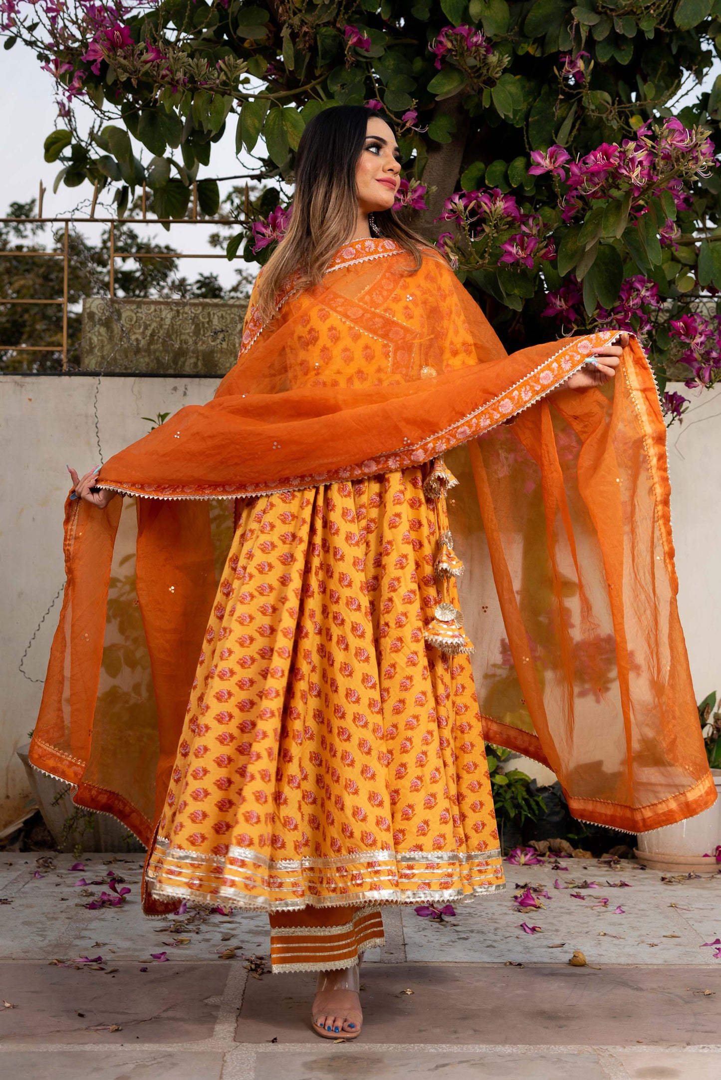Color: BrownFabric : Anarkali : Pure cotton Pant: Pure cotton Dupatta: Oragnza PRINT : Hand block work : Gotta lace work No. Of Components : Set of 3