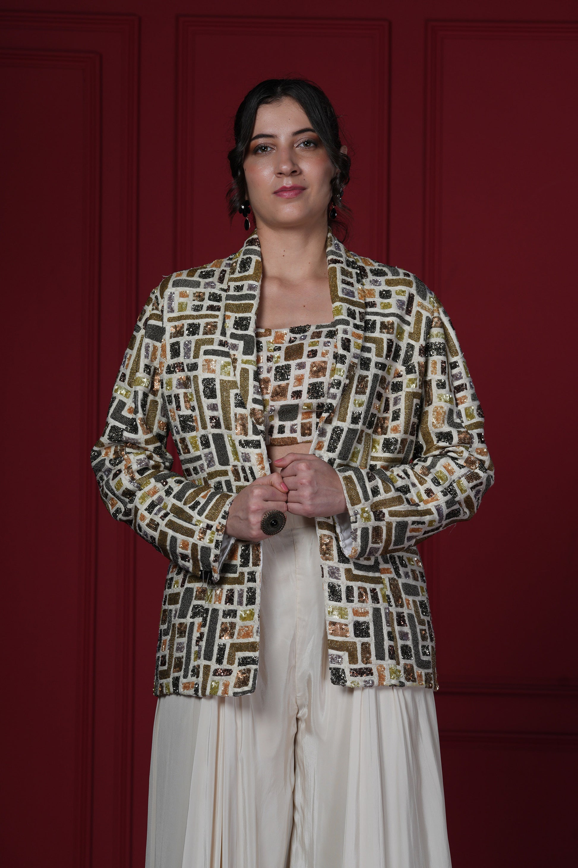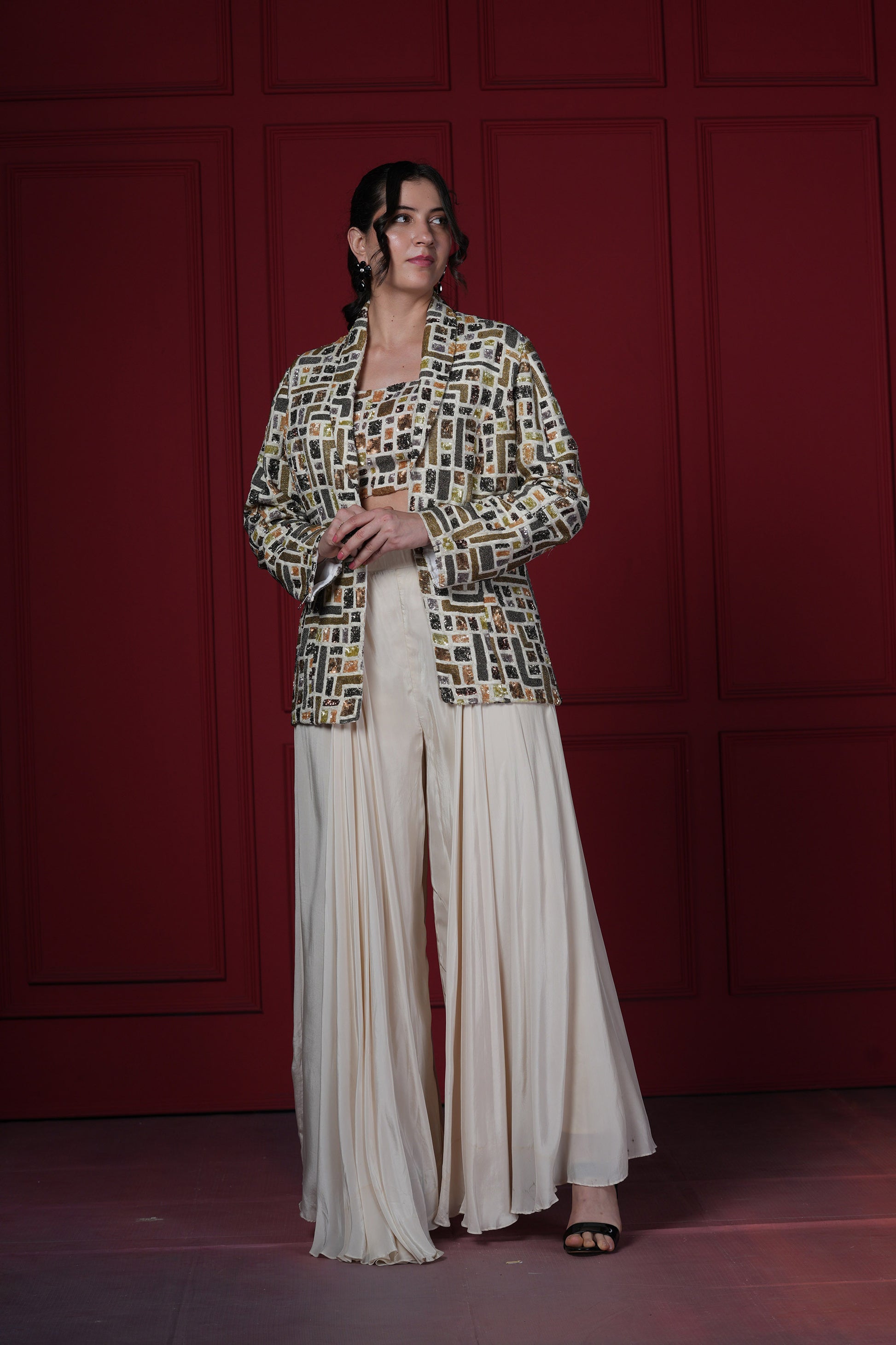 Modern ensemble that has a geometric print handwork on the blazer & spaghetti with plain pleated palazzo pants