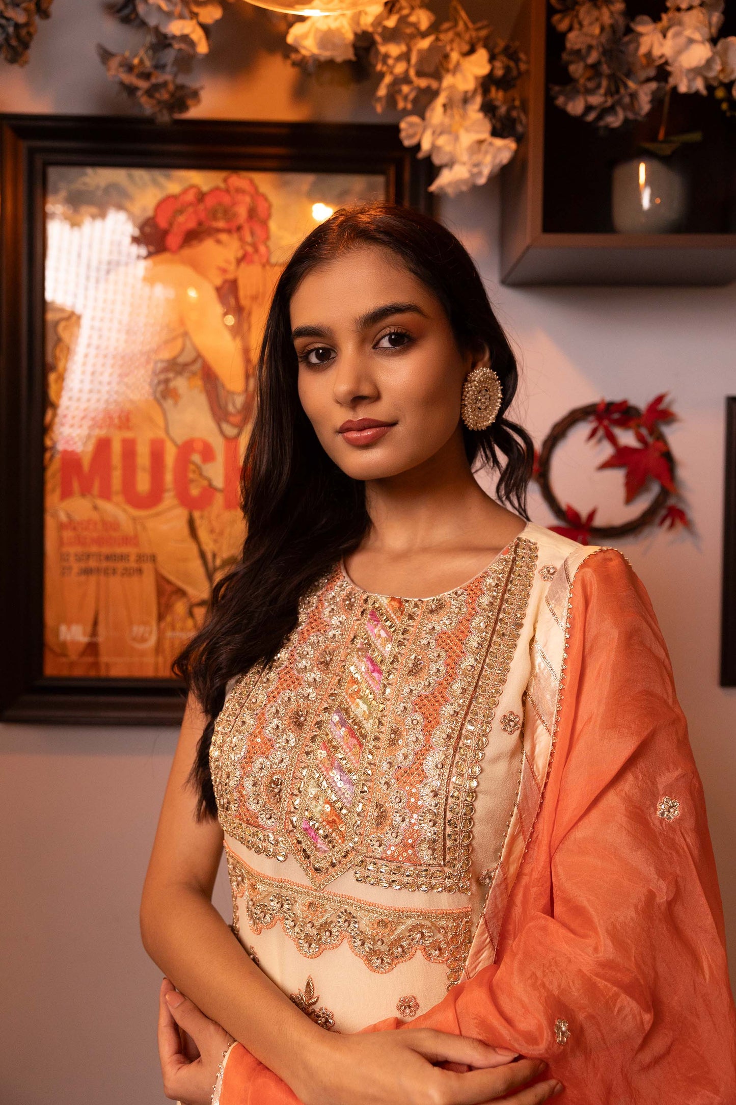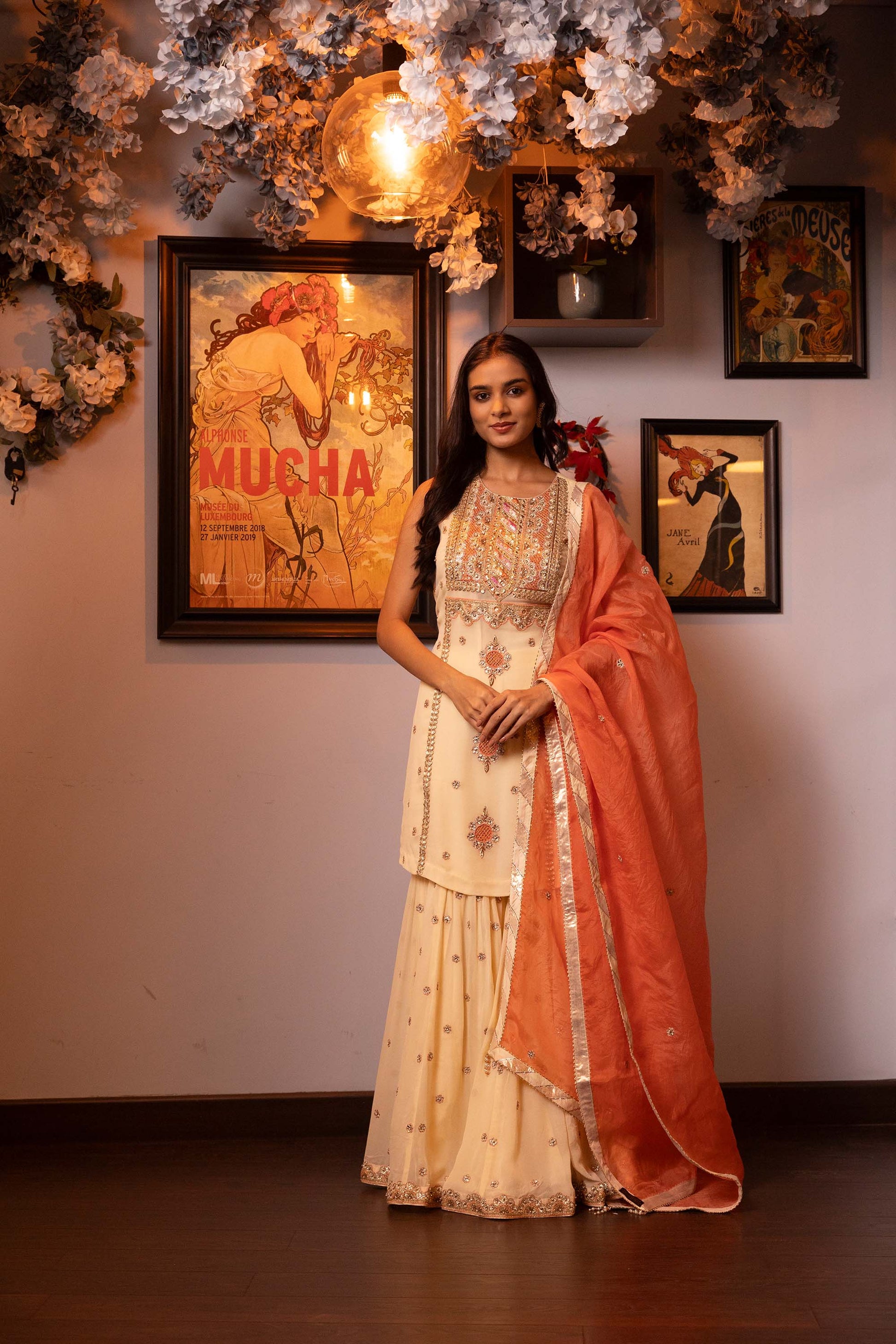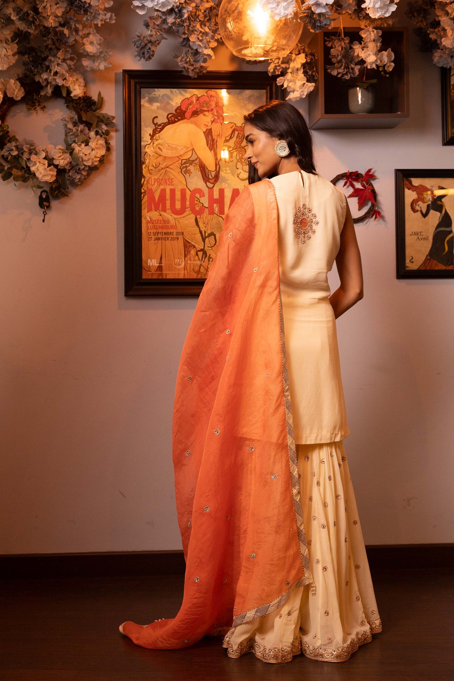 Featuring off white silk georgette embroidered kurta with georgette embroidered sharara pant and embroidered organza dupatta