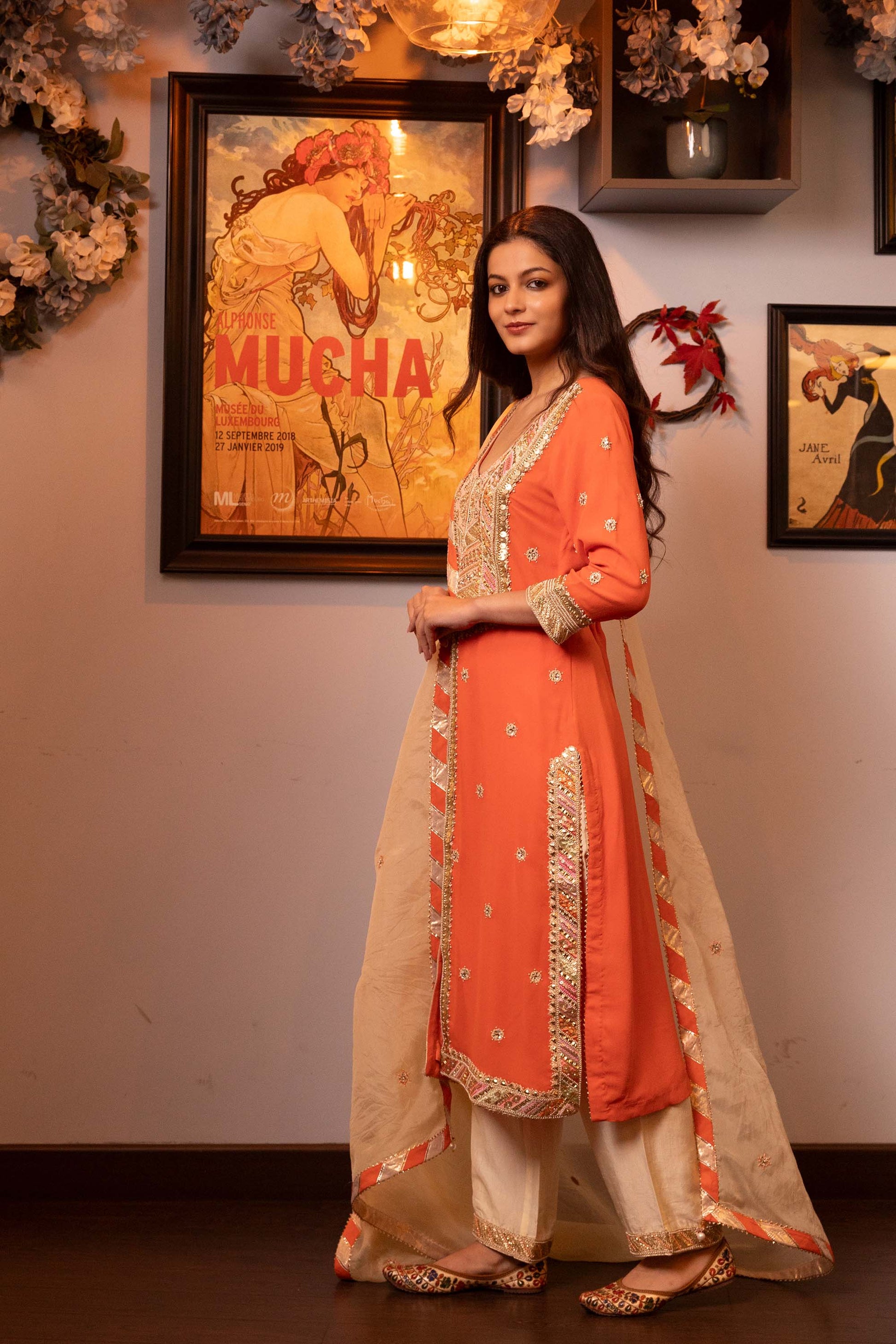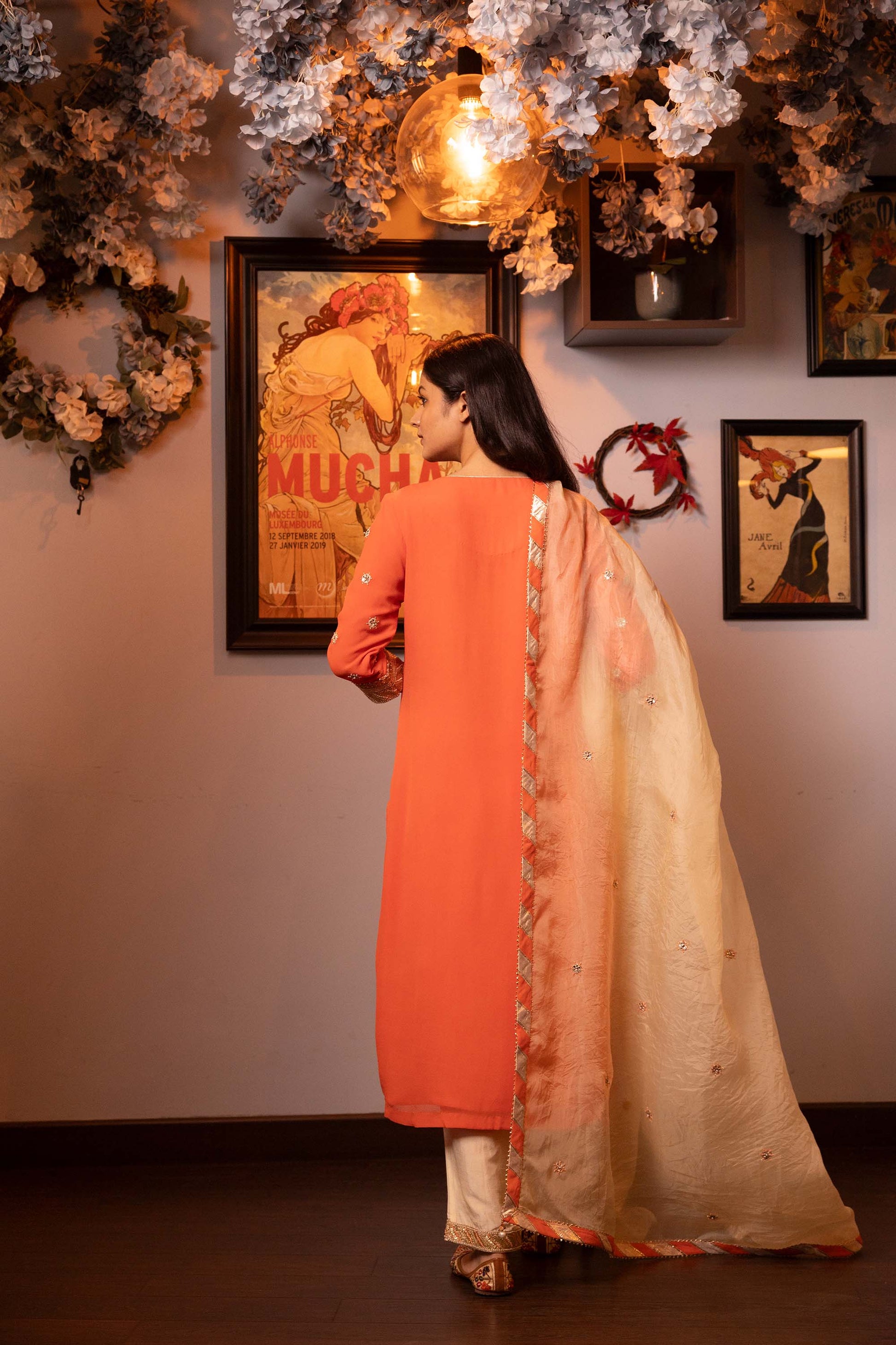 Featuring Orange silk georgette embroidered kurta with viscose dupion embroidered narrow pant and embroidered organza dupatta
