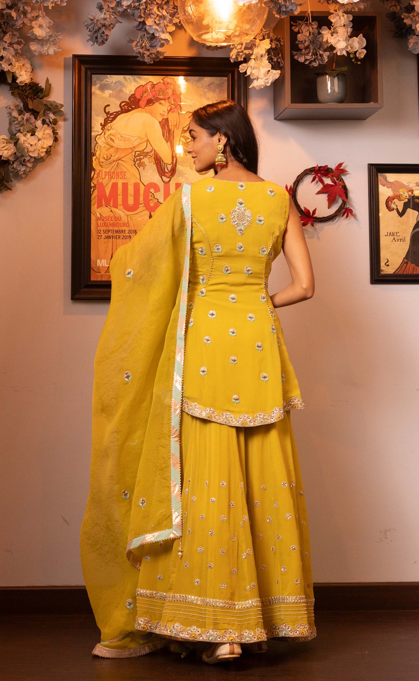 Featuring Yellow silk georgette embroidered kurta with georgette embroidered sharara pant and embroidered organza dupatta