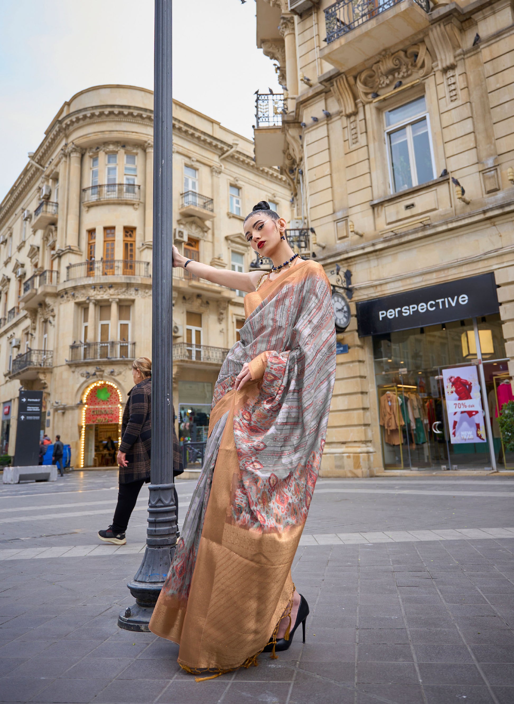 Does your wardrobe need more versatility? Then, check out this. Let your skin feel the refreshing touch as you adorn this superior-quality lightweight Saree to match the overall modest design.