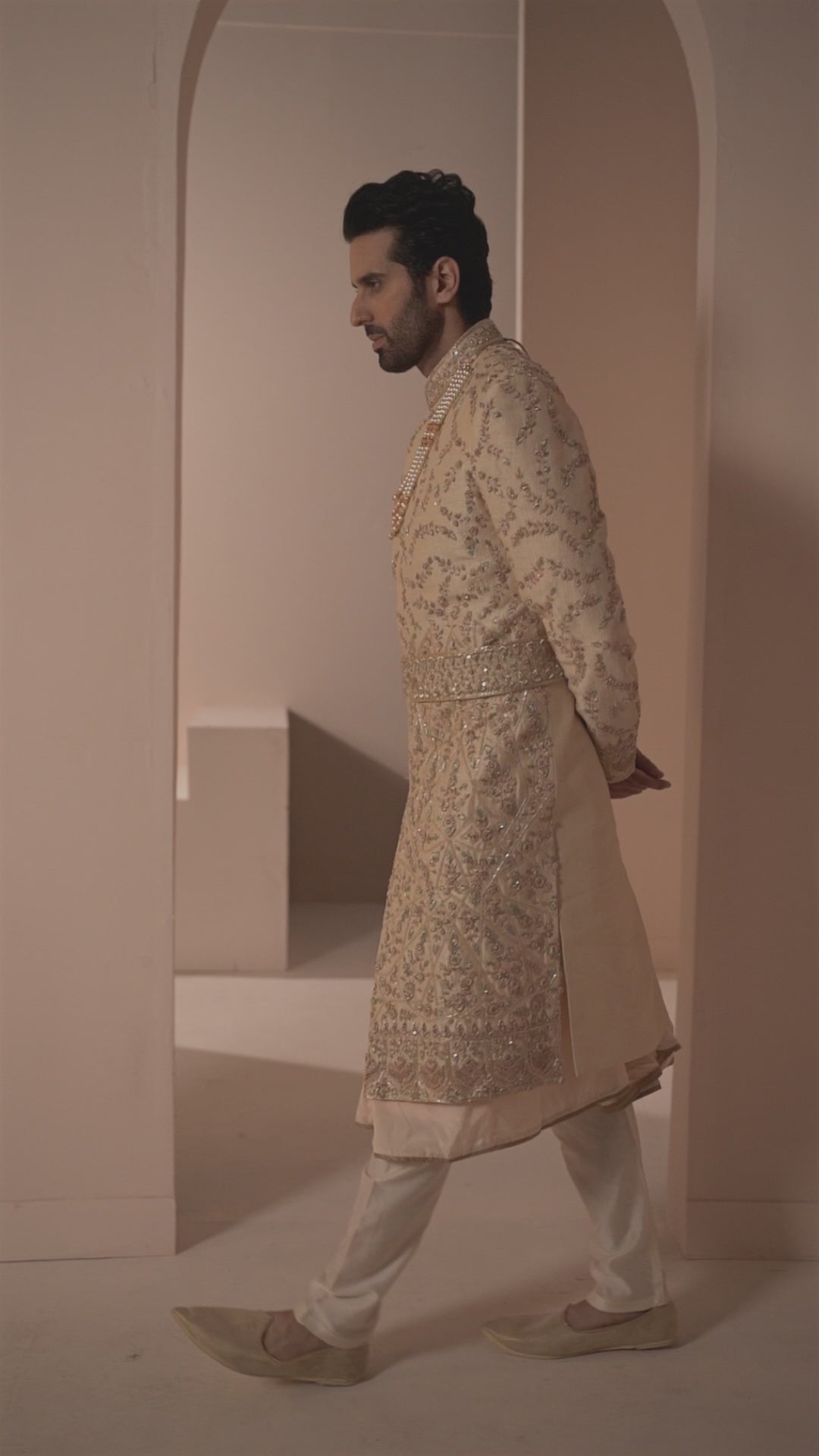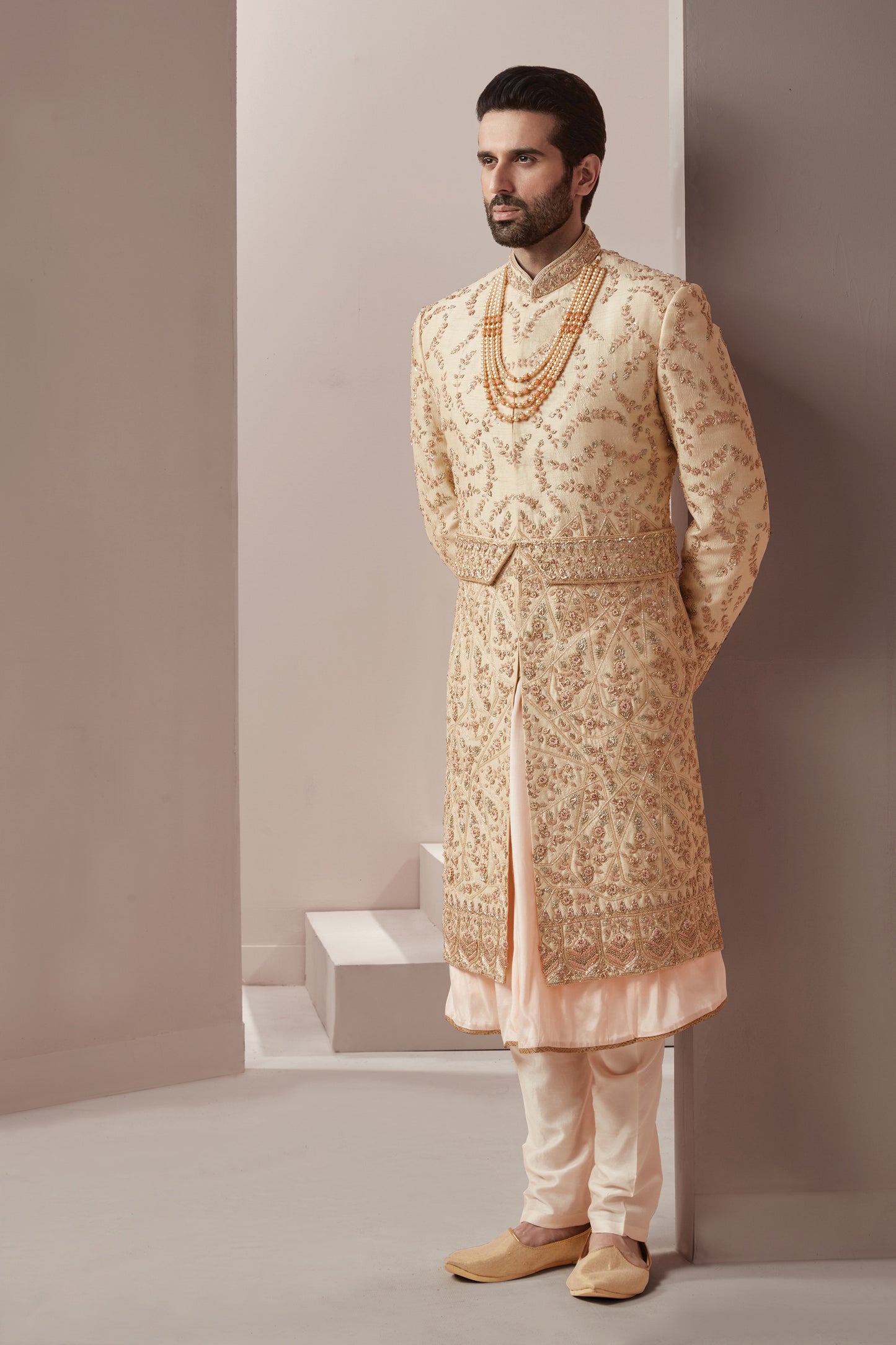 This is a handcrafted sherwani with resham work, cut-dana, sequins and salli work with floral jaal of zardosi and kora work all over. It comes with light peach peshwahi kurta, a cream colored cotton silk churidar and a matching kamarbandh.