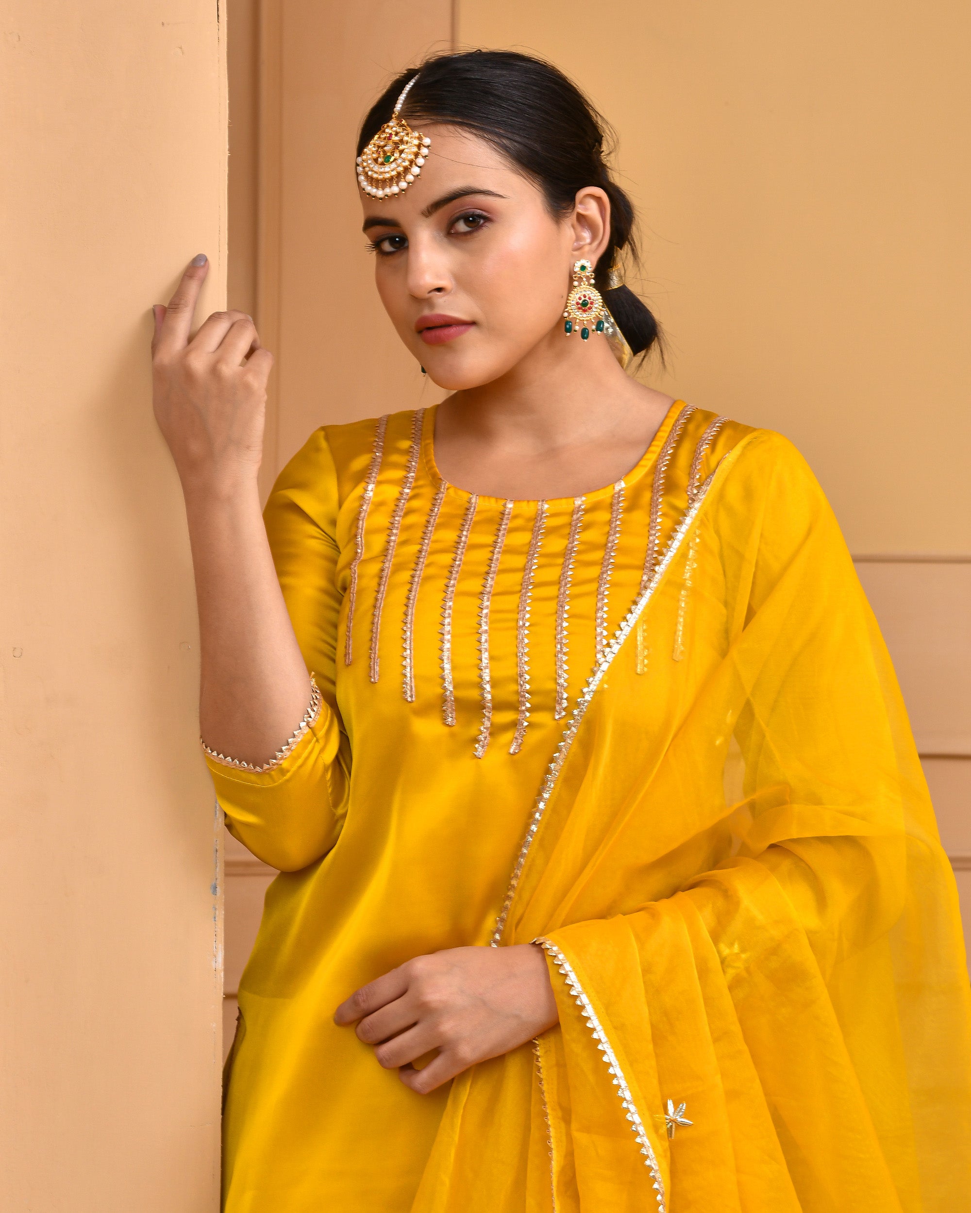 Expertly crafted from luxurious satin silk, this Gold Dust Sharara Set exudes elegance and sophistication. With its flowing sharara pants and intricate patterned top, it brings a touch of glamour to any occasion.