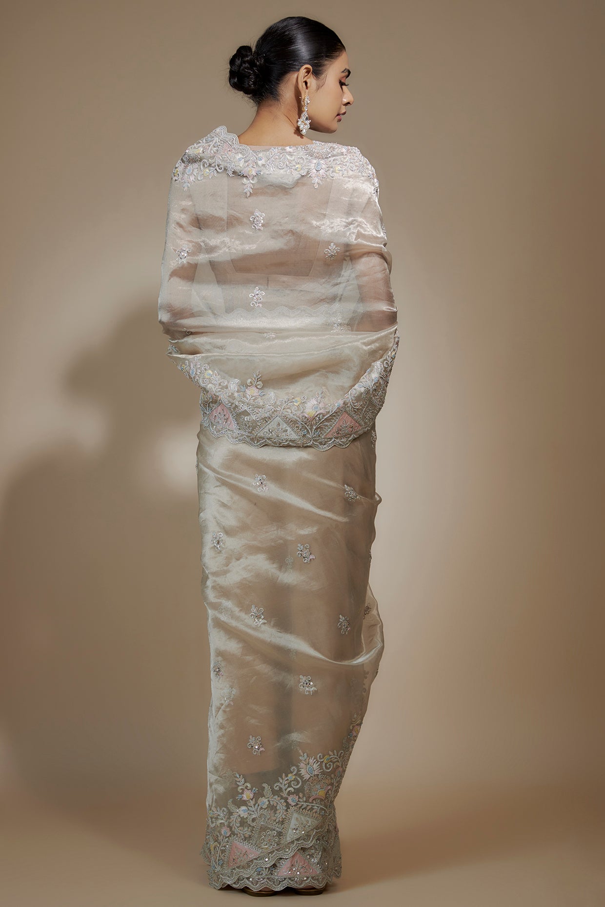 Gold Saree In Tissue Organza Base With Sequin Embellishments. It Is Paired With An Unstitched Blouse Fabric. Accentuate It With Statement Jewellery And Heels For A Wedding Or Engagement Ceremony.
