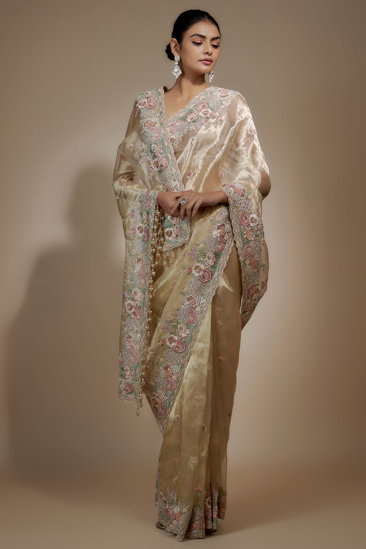 Featuring A Gold Saree In Tissue Organza Base With Sequin Embellishments. It Is Paired With An Unstitched Blouse Fabric. Accentuate It With Statement Jewellery And Heels For A Wedding Or Engagement Ceremony.