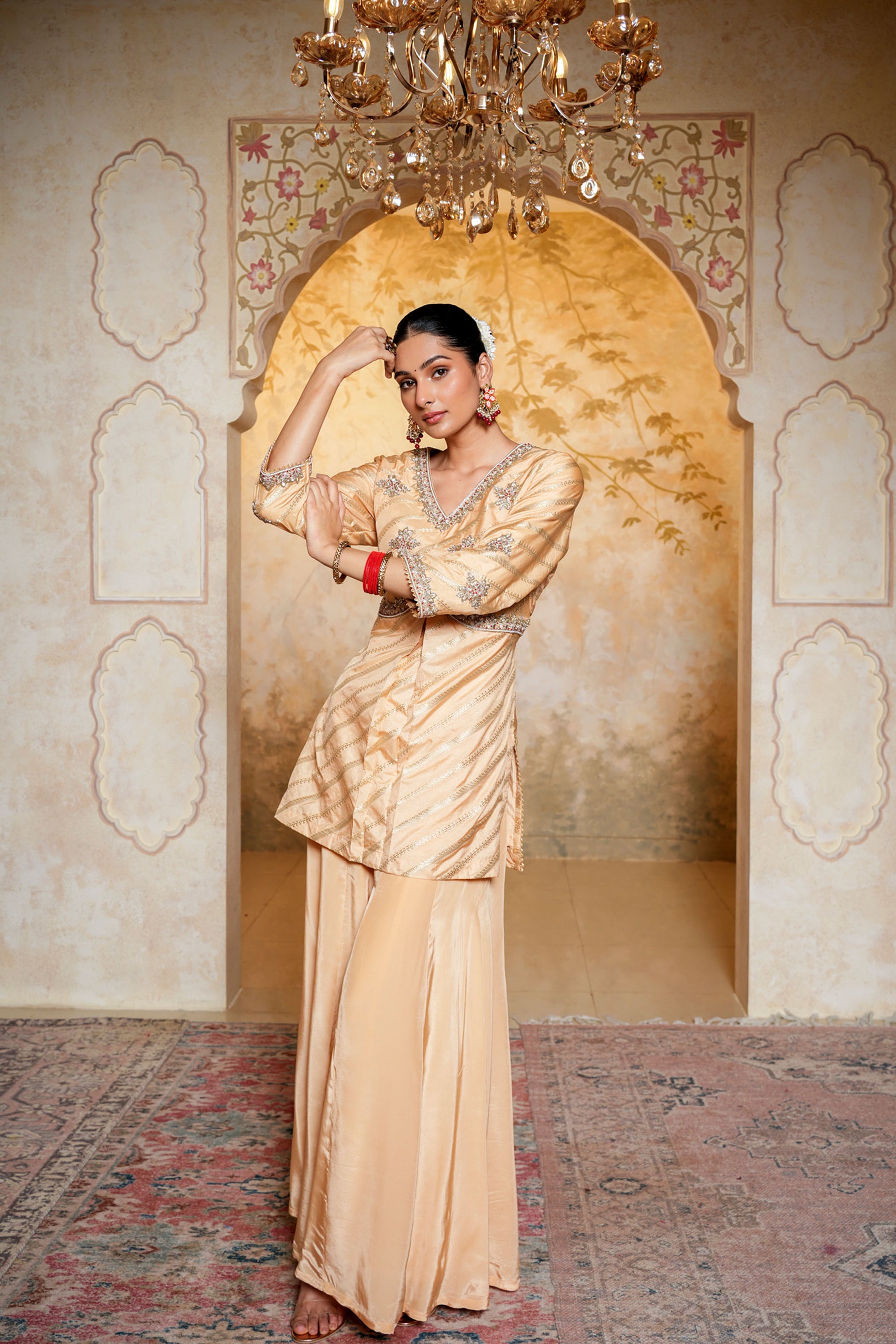 Prepare to turn heads in banai silk sharara set. Designed from the finest banai silk fabric in beautiful beige colour.