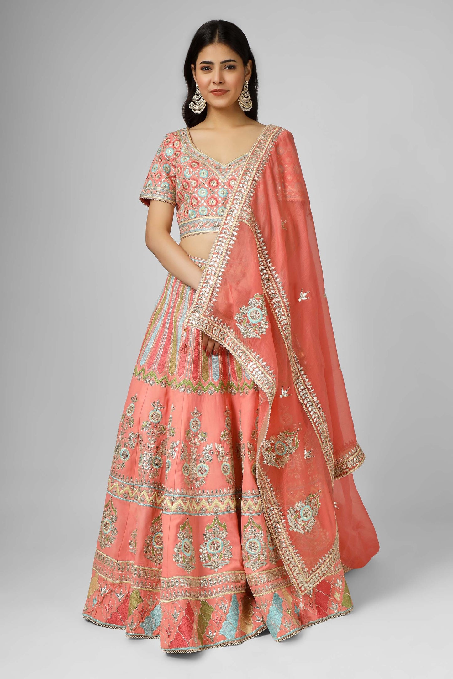 Featuring a Orange embroidered Lehanga set in pure silk georgette, with matching georgette straight blouse and organza dupatta