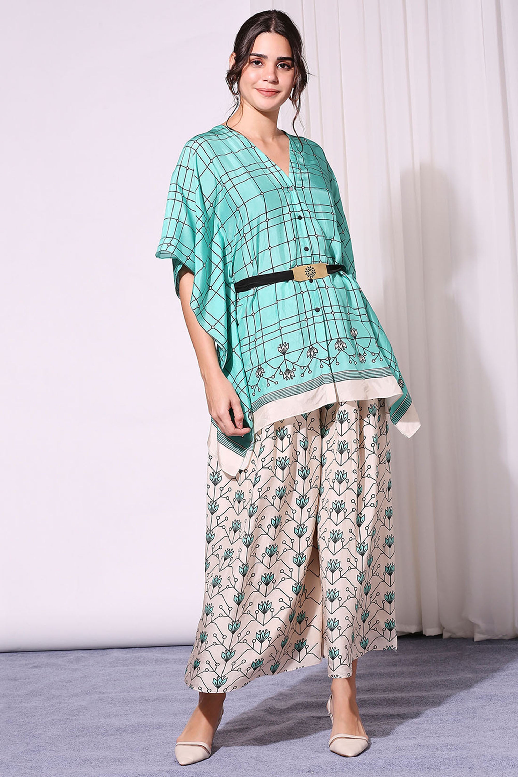 Green and cream Tussar Silk Summer Floral Printed Kaftaan Top And Pants