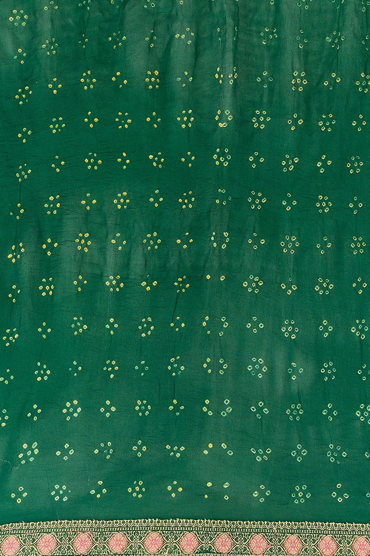 Featuring A Green Saree In Bandhej Handloom Base With Dabka, Sequins And Thread Hand Embroidery. It Is Paired With An Unstitched Blouse. Accentuate The Designer Saree With Polki Jewellery, Embellished Heels And A Potli Bag For Your Wedding, Mehendi Or Engagement Ceremony.