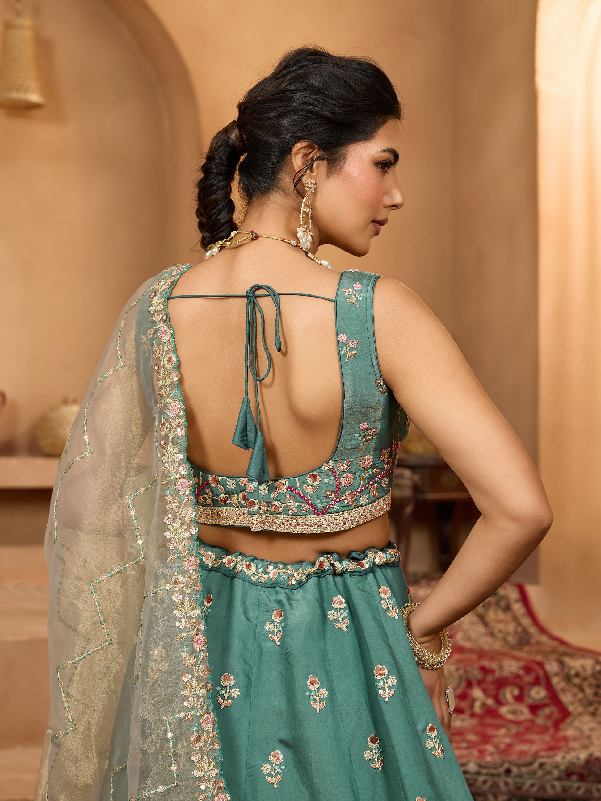 • Lehenga:- Made of premium quality Green Color with Georgette fabric Full Flaire Semi-Stitched Lehenga With sequins and stone and Coding work has a thread Embroidery work. Has a thread cutwork border on the hemline.
