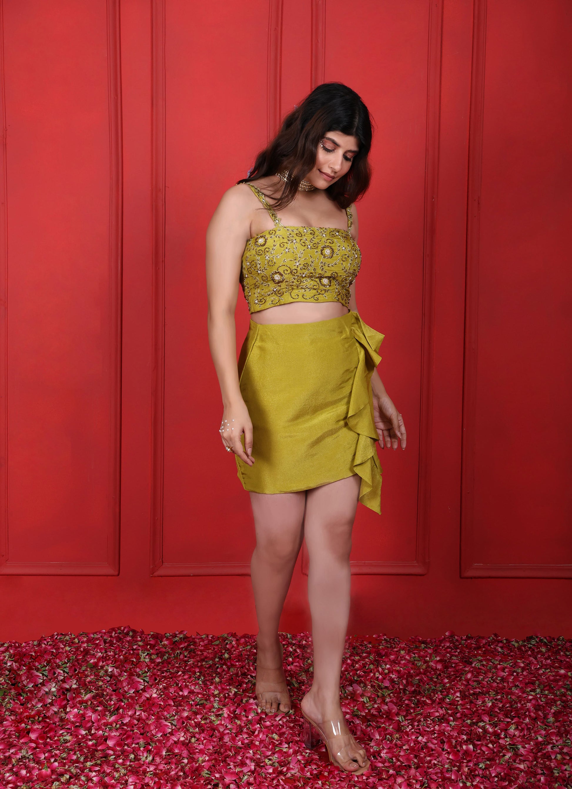 Green Lemon Ginger Hand Embroidered Blouse With Mini Ruffle Skirt