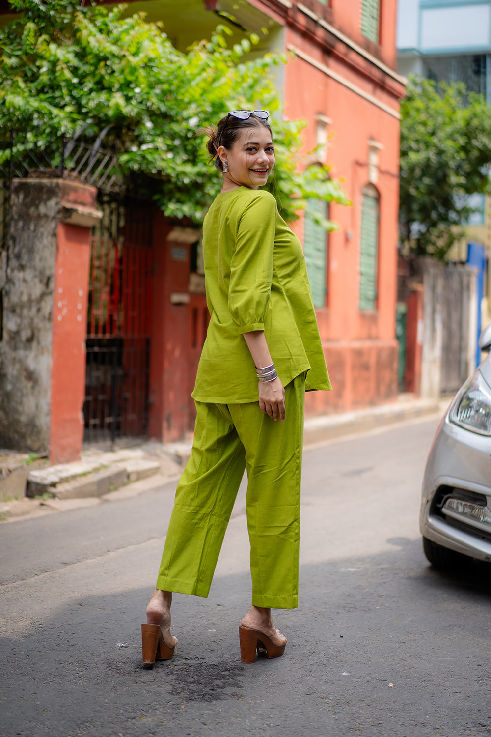Stay stylish this summer with our Green Malai Cotton Co-ord Set. Featuring a chic V-neck and comfortable three-fourth sleeves, this outfit is perfect for any casual outing. Made from soft, breathable malai cotton, it ensures you stay cool and fashionable all season long.