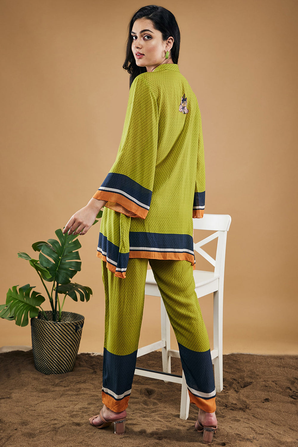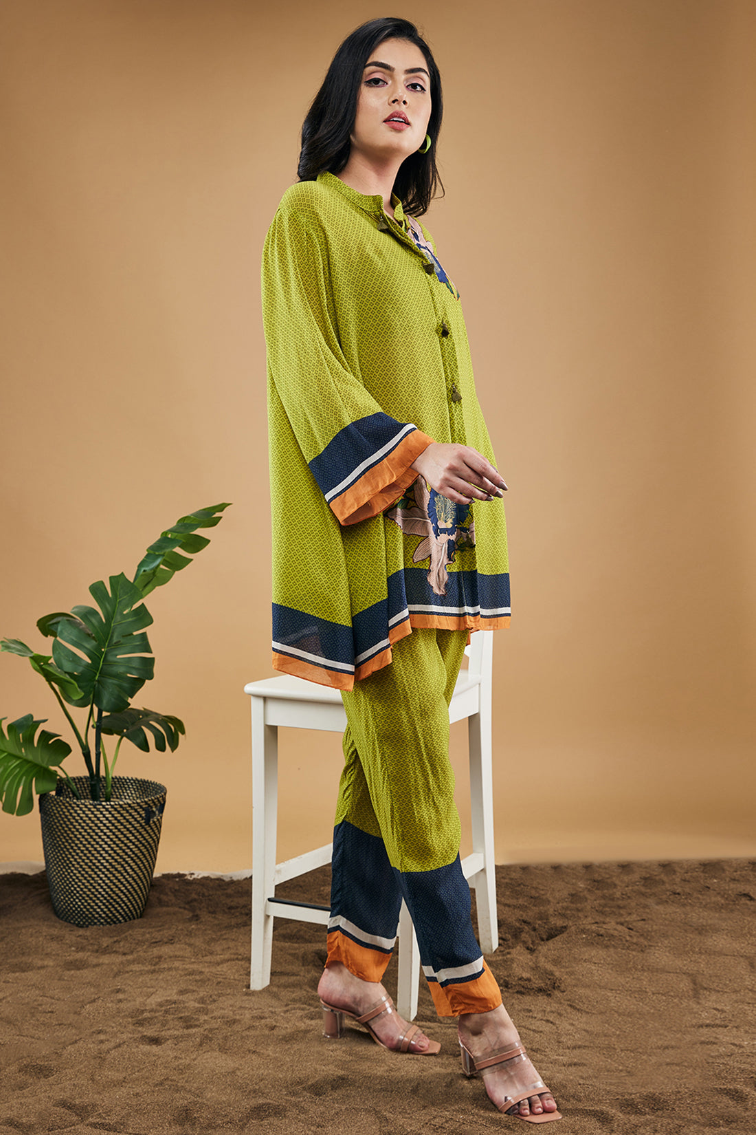 Green Orchid Bloom Printed Shirt With Flared Sleeves And Pants In Cotton Silk.