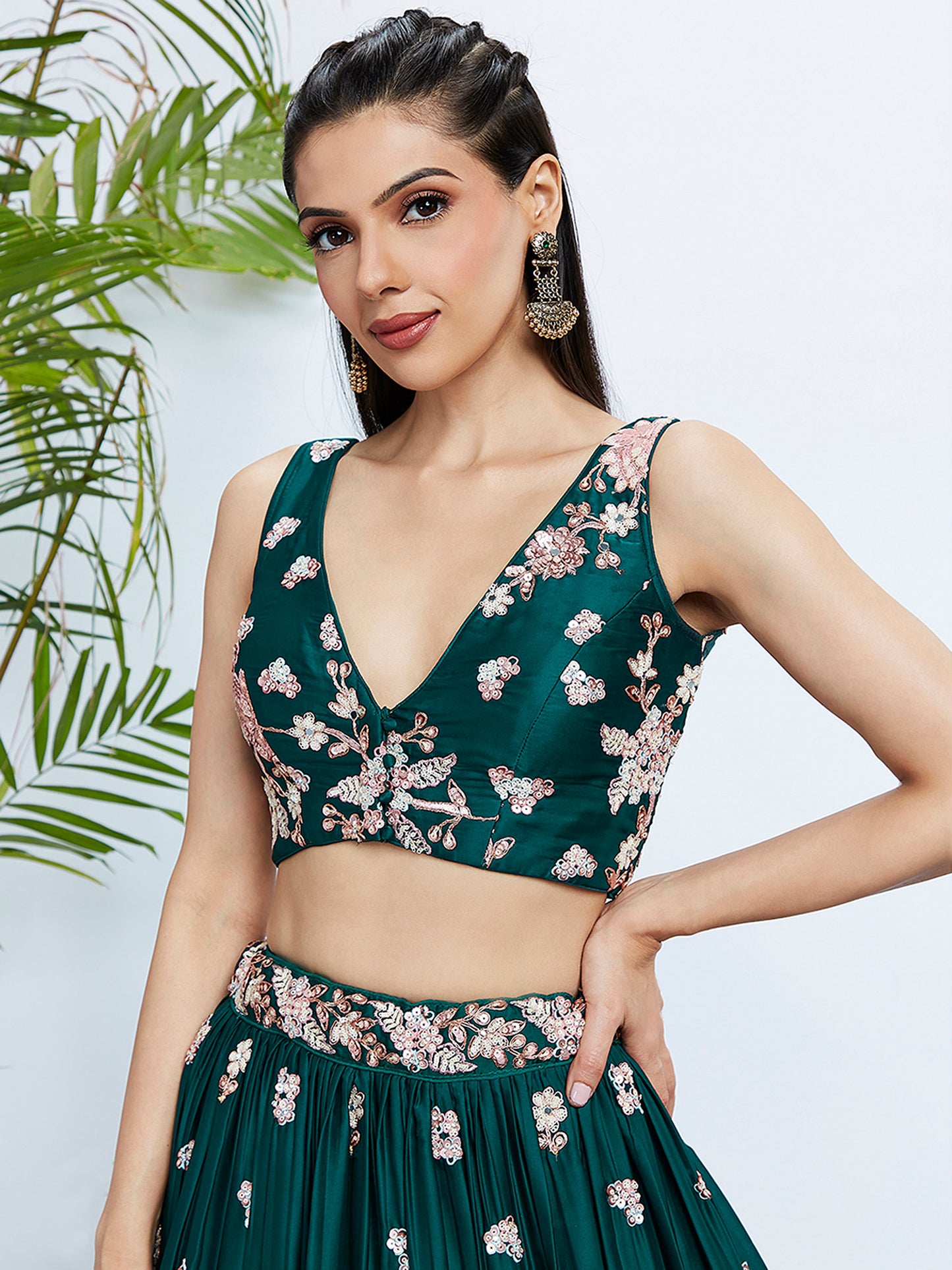 Green Pure Georgette Sequins and thread embroidery Lehenga