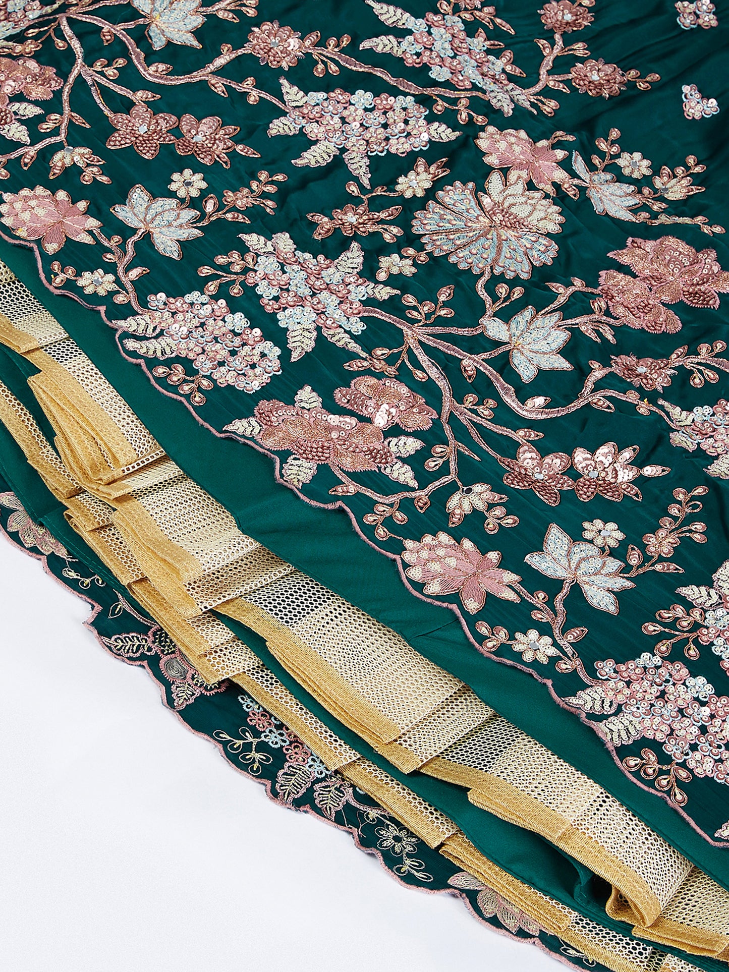 • Lehenga:- Made of premium quality Green Colour Pure Georgette fabric Full Flaire Semi-Stitched Lehenga With heavy Sequins and thread Work Embroidery. Has a Plain border on the hemline.