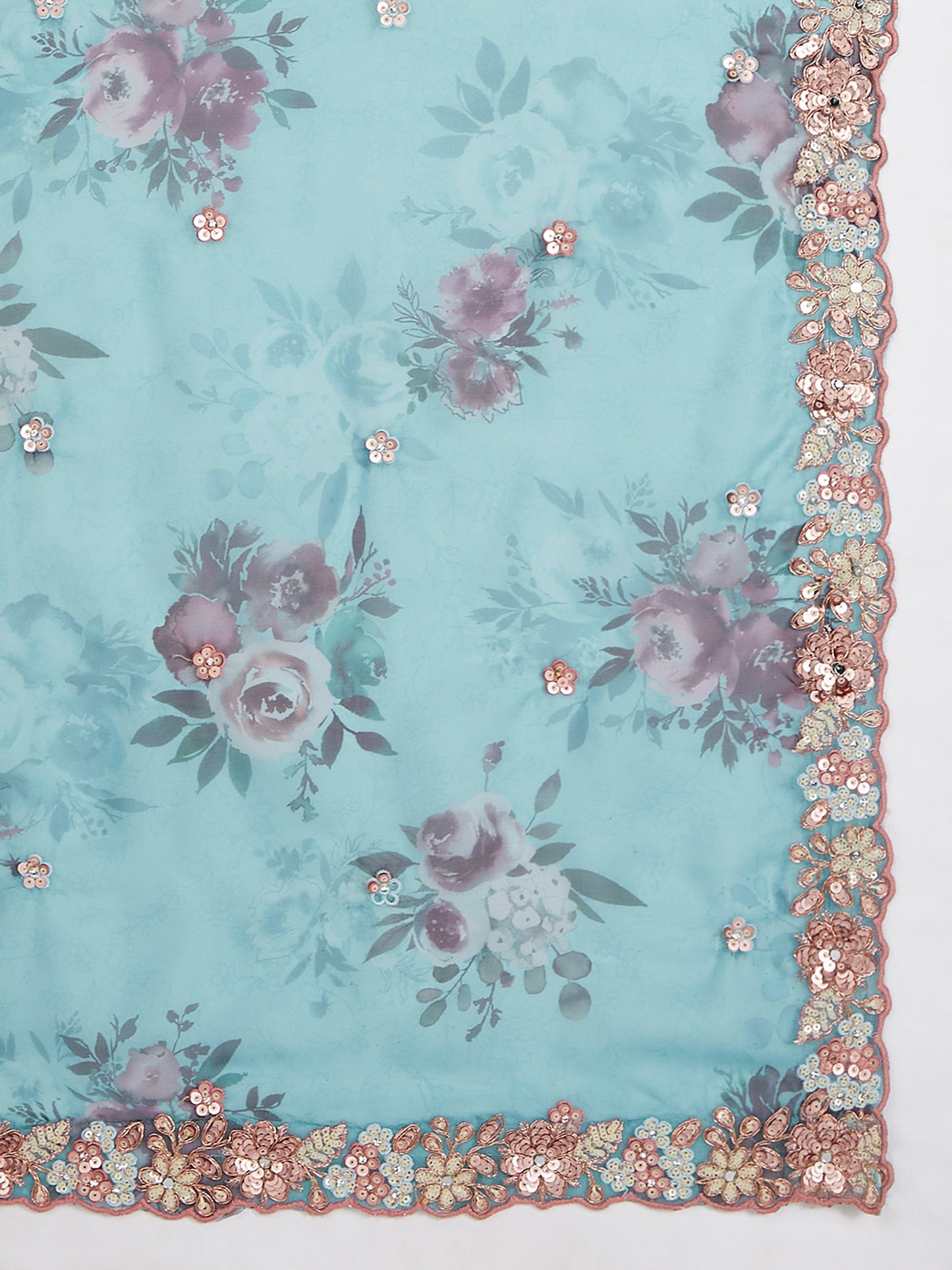 • Dupatta:- Sea Green Organza Floral digital print Dupatta has a multi colour sequinse work Ethnic motif with Embroidery lace Border has a latkan on thr corner.