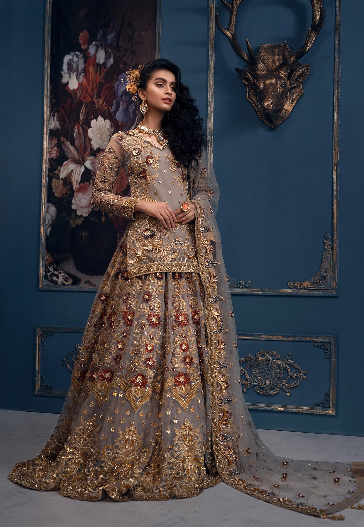 The beauty of this Lehenga choli lies in its grey heavy embroidered net fabric. The usage of heavy bordered net fabric with a subtle contrast between the base and the border gives this product a classic look. The attire is completed by wearing it with matching bottoms and embroidered dupatta.