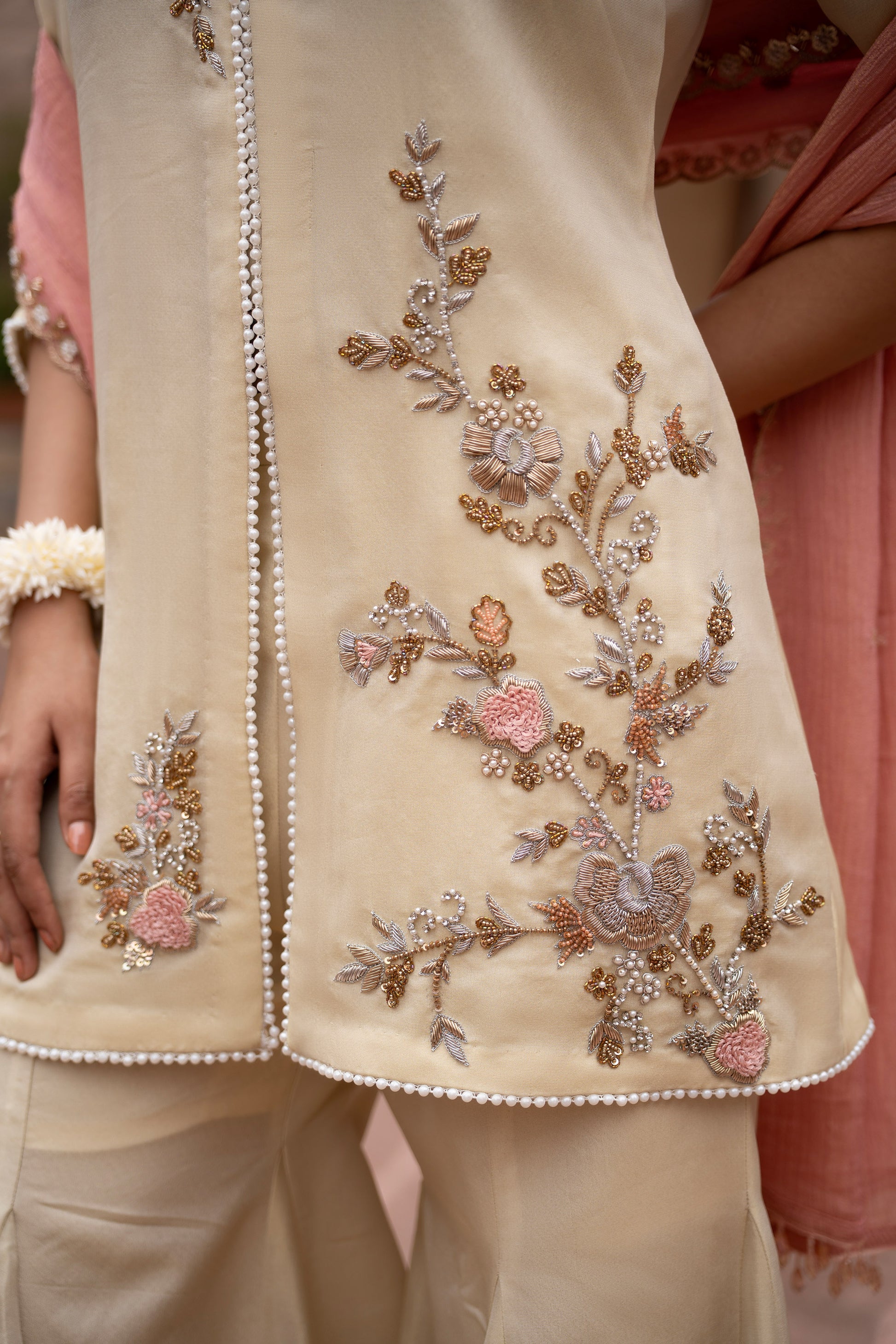Ethereal and elegant, this off white kurta set features intricate hand embroidery in zari and resham on the kurta, adding a luxurious texture and subtle shimmer. Both the kurta and gharara are crafted from rich tissue fabric, providing a graceful drape and a refined silhouette.