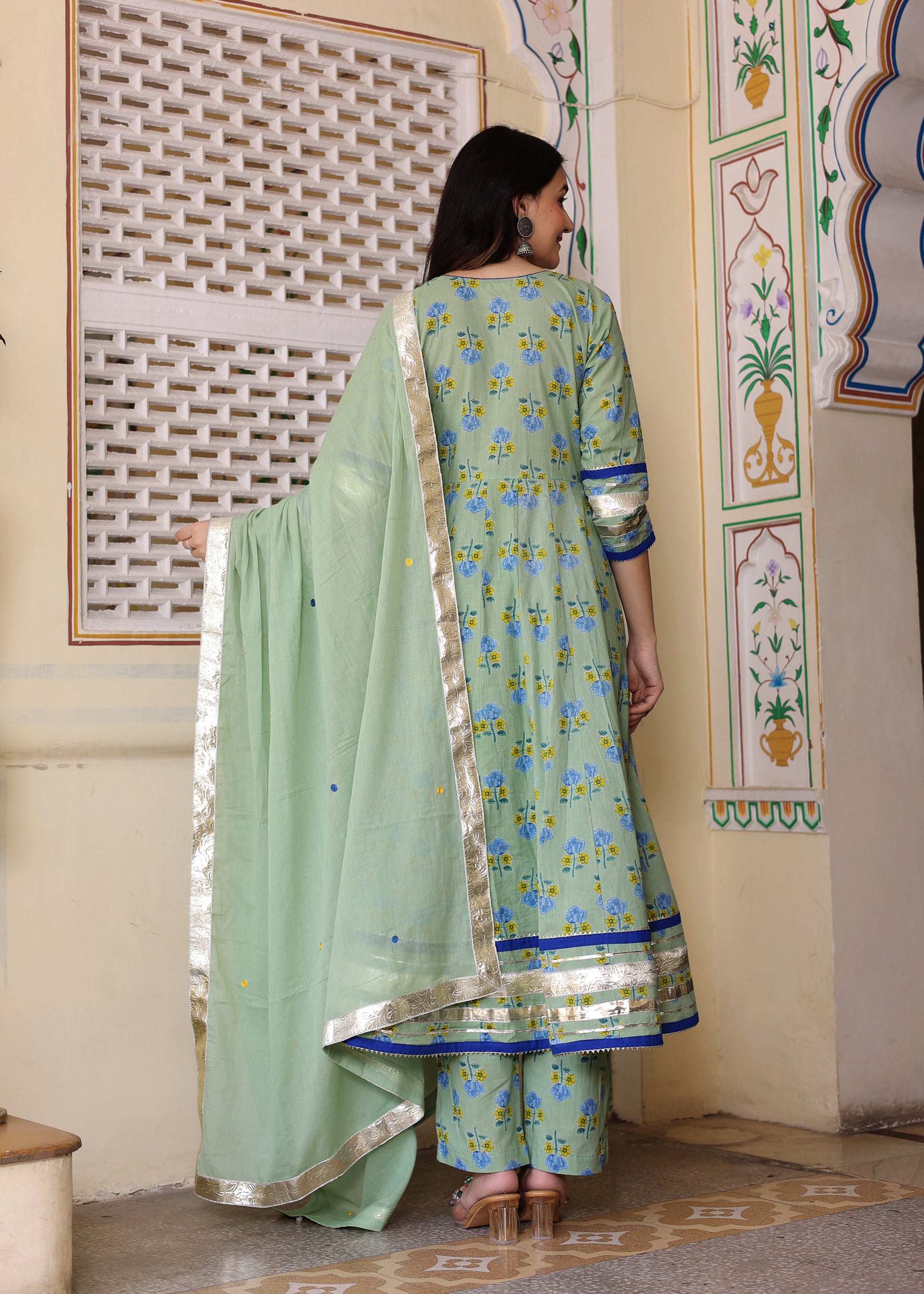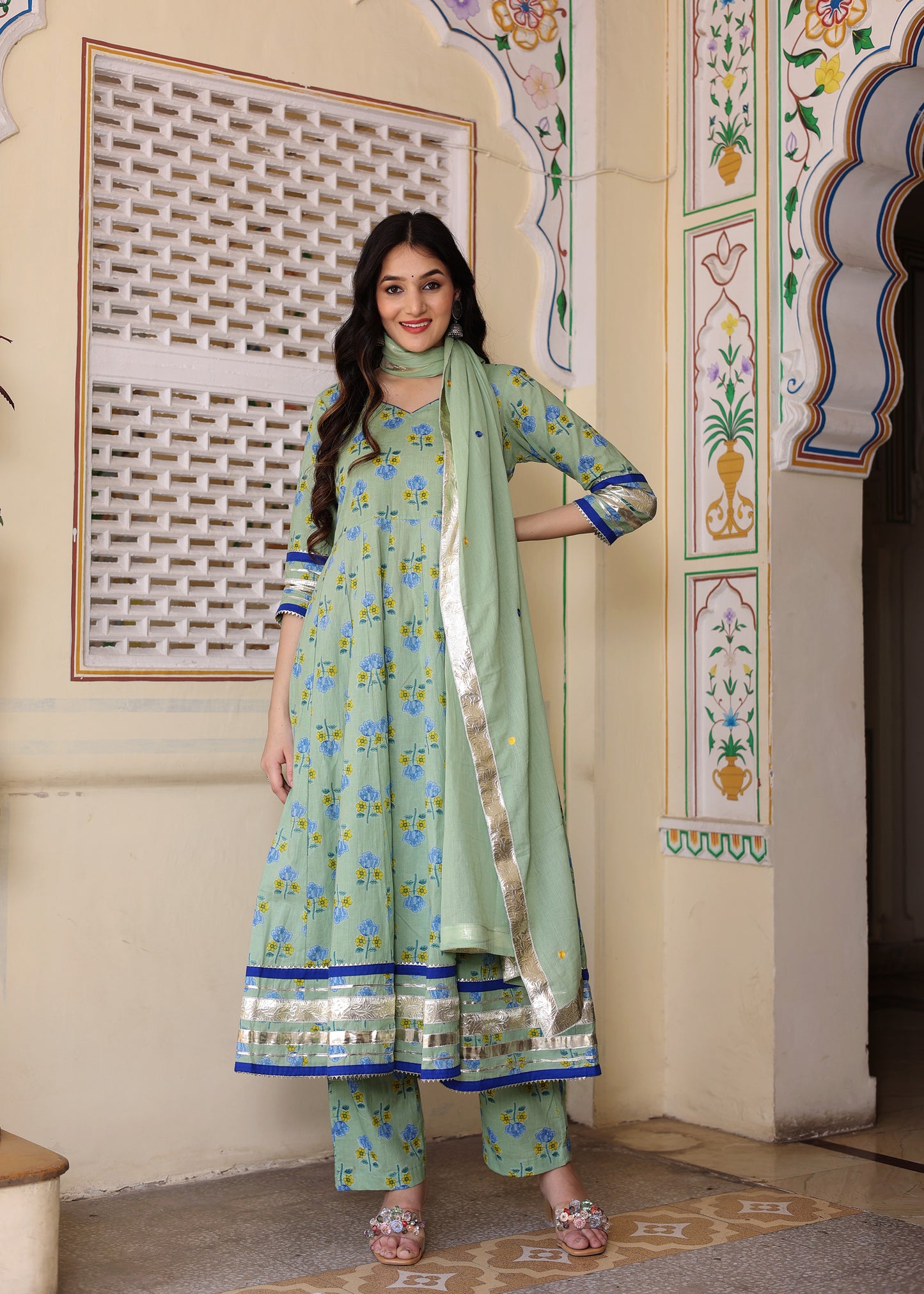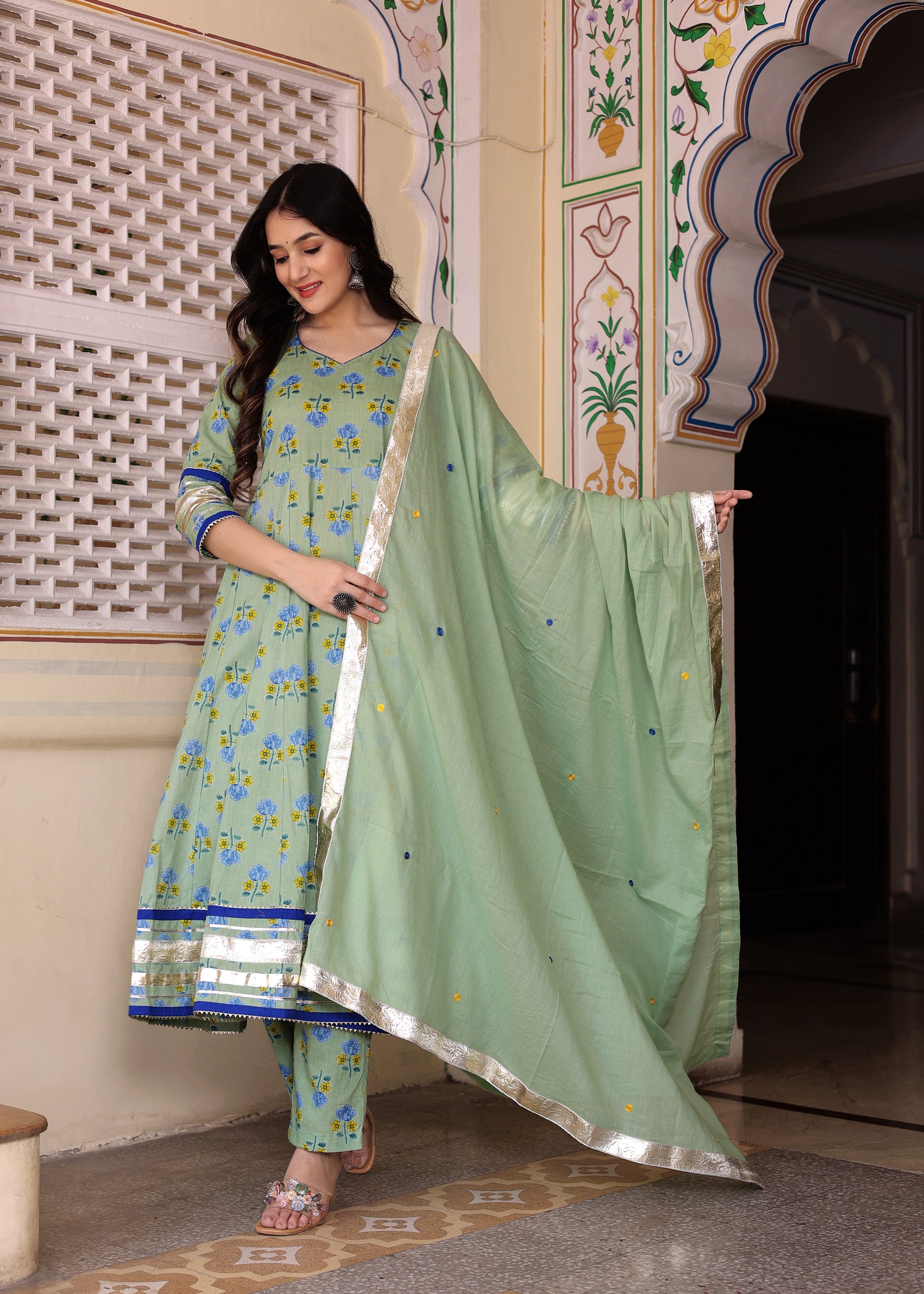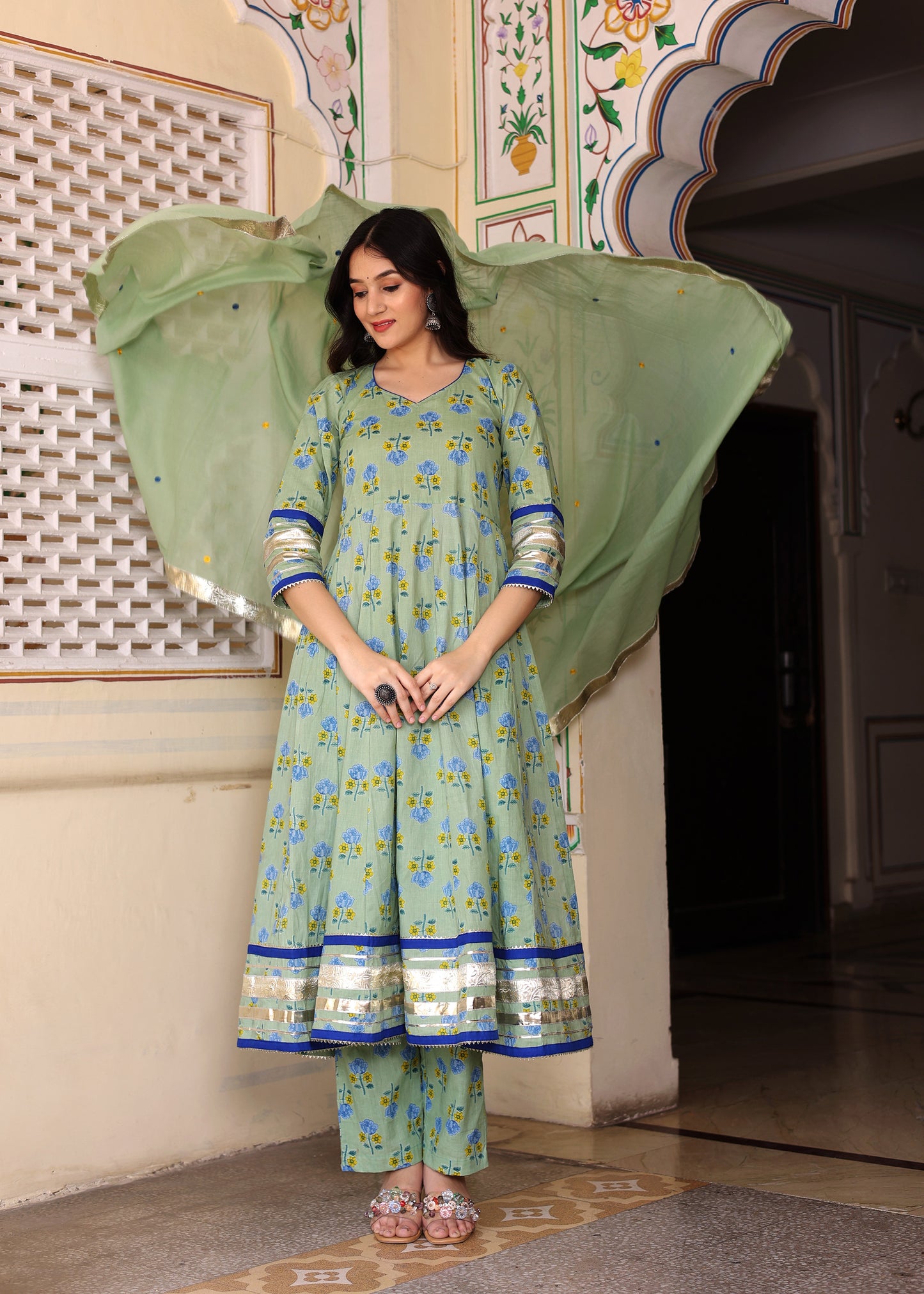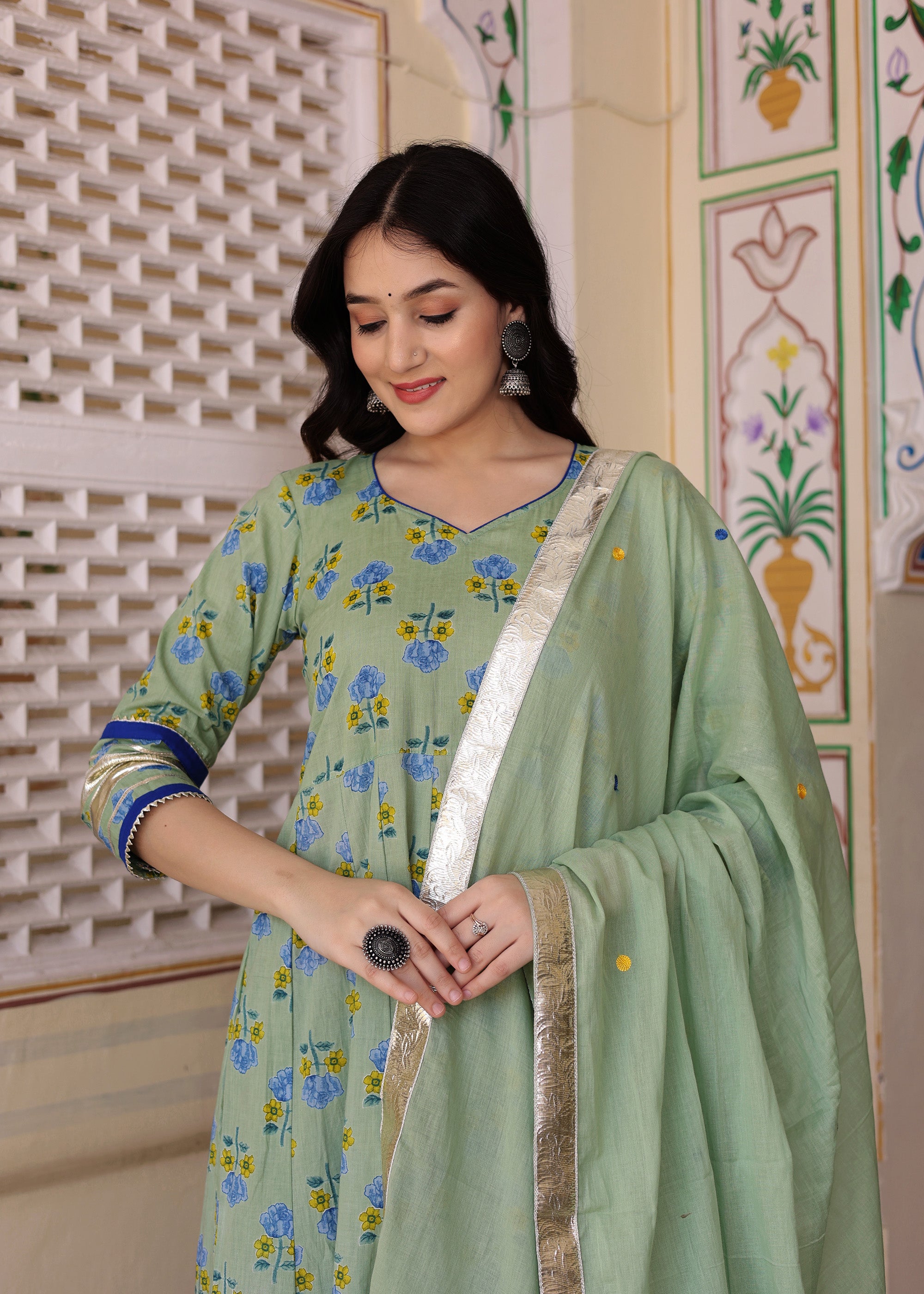 This elegant anarkali set is crafted from high-quality cotton, ensuring comfortable and breathable wear. Adorned with delicate gota work, this traditional ensemble adds a touch of sophistication to any occasion.