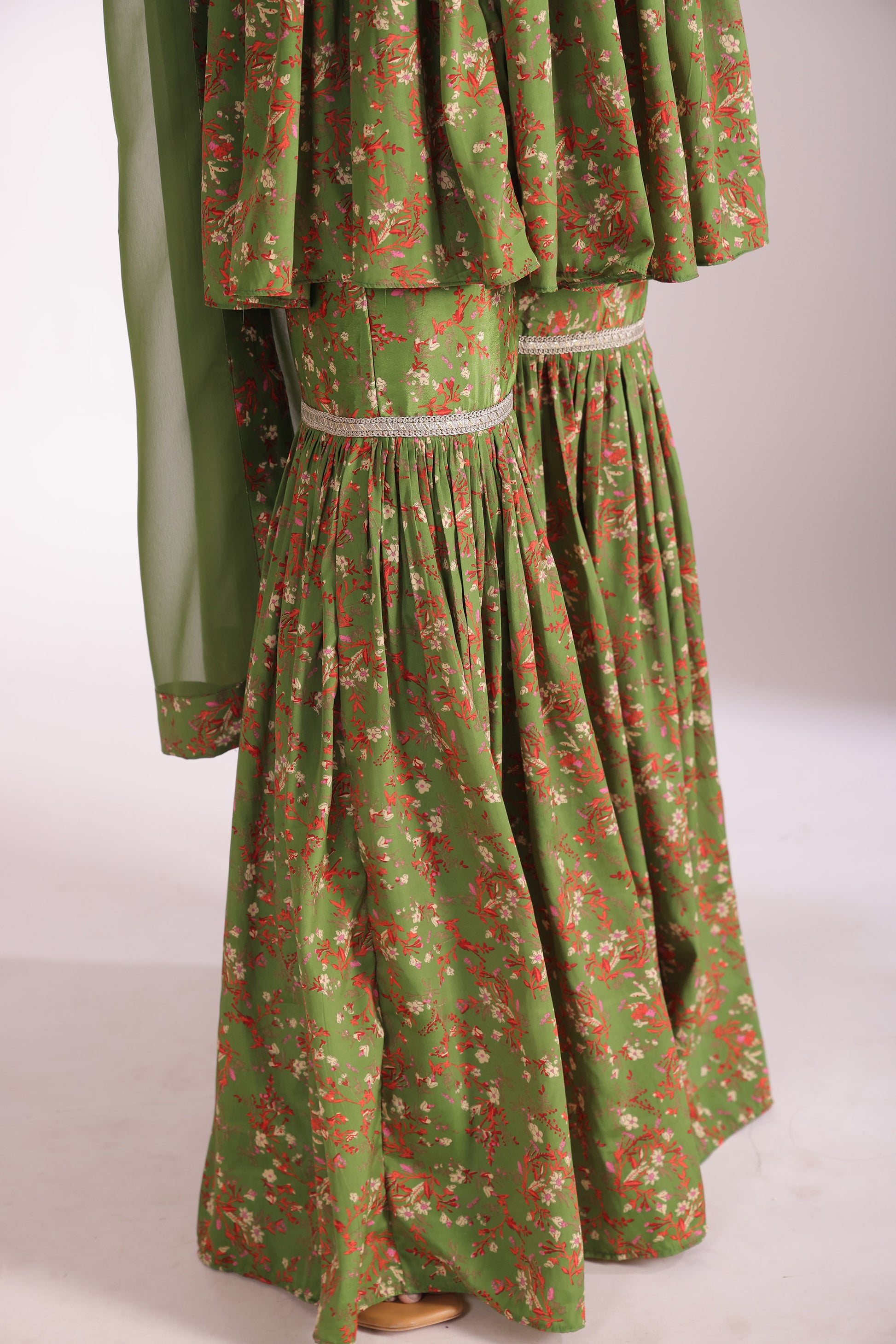 Gulzar Green Printed Crepe Silk Peplum With Gharara And Dupatta