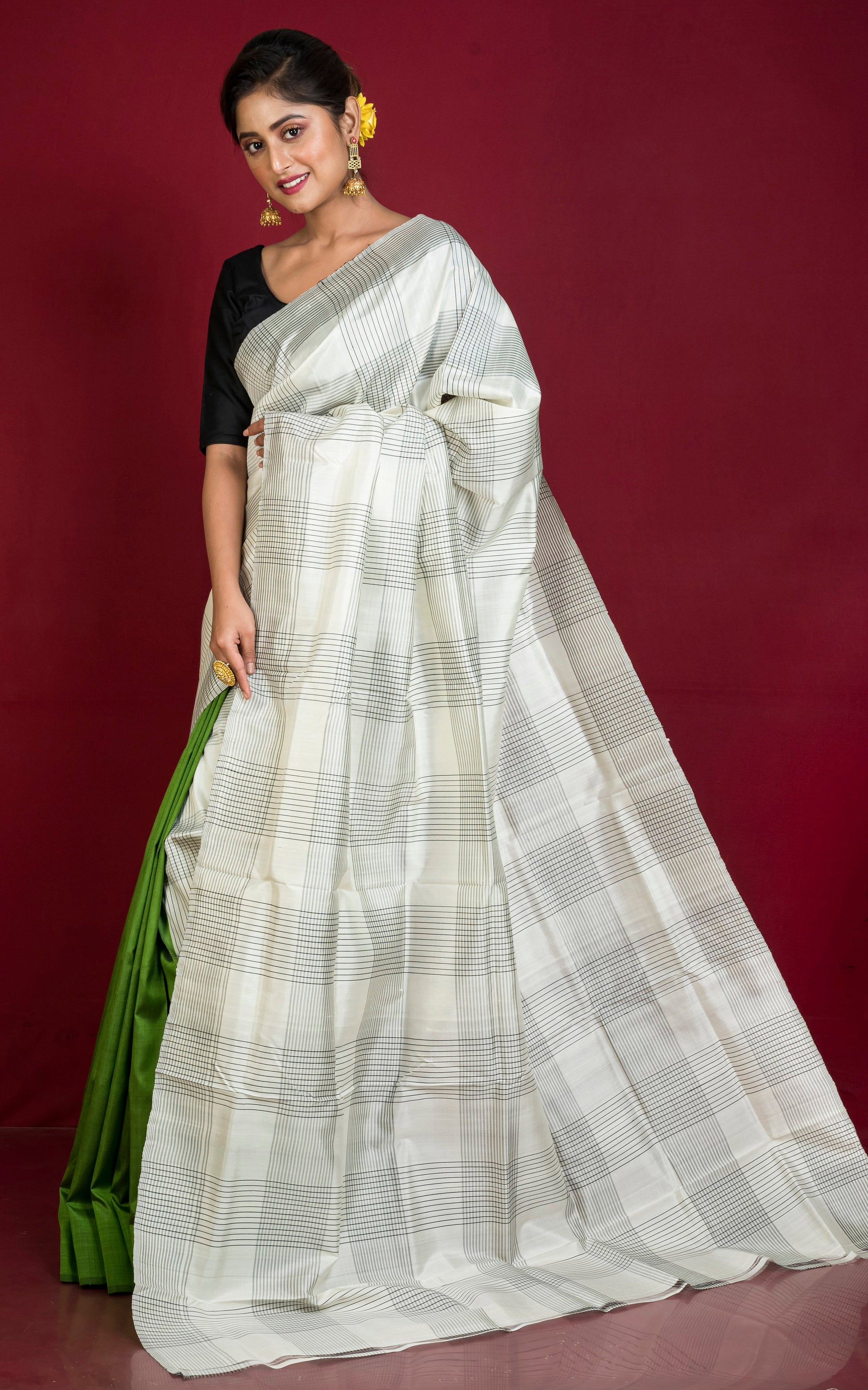 Half and Half Soft Bishnupuri Katan Silk Saree in Off White, Black and Green