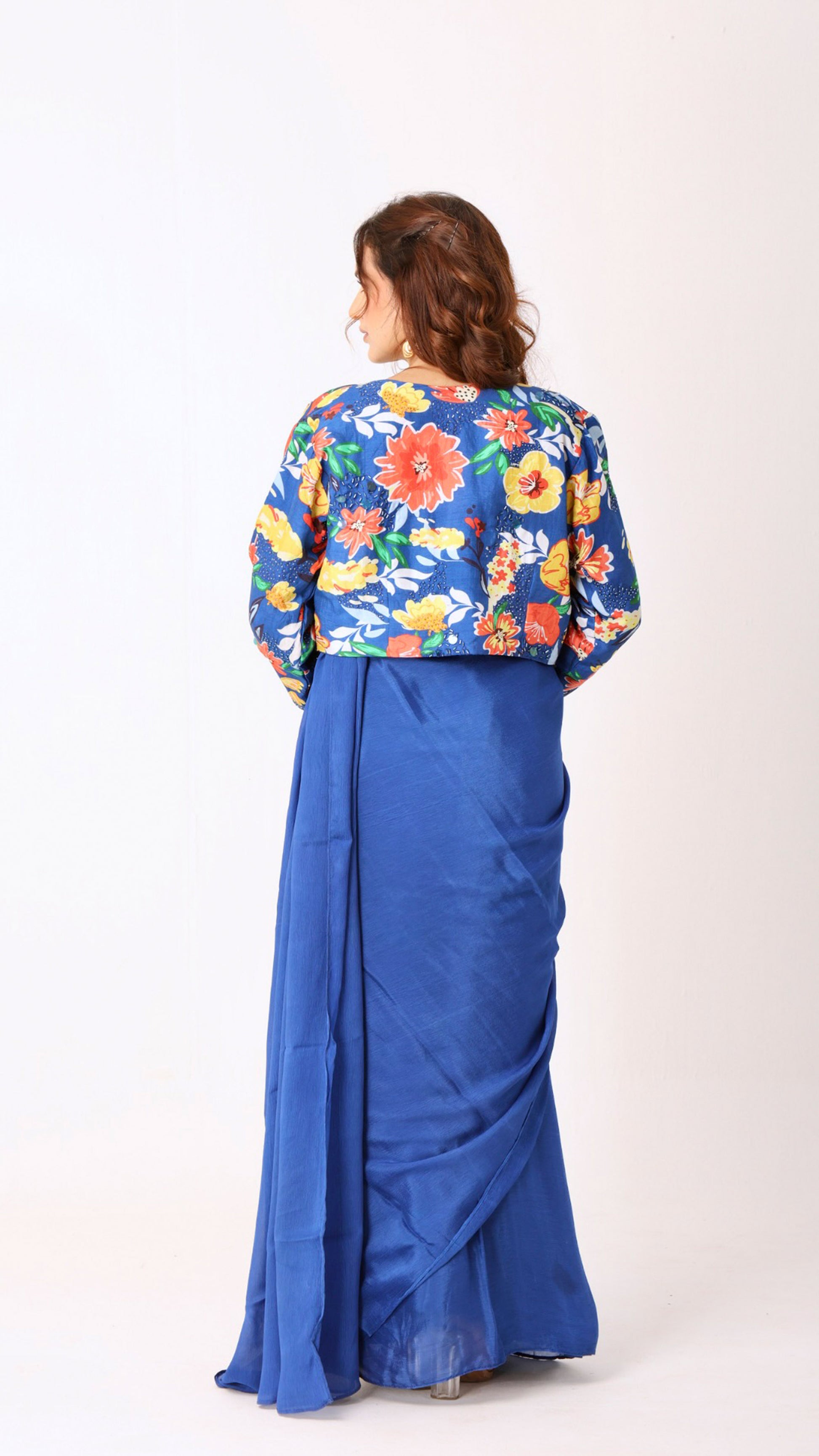 Hand-embroidered blouse and jacket paired with a solid blue saree