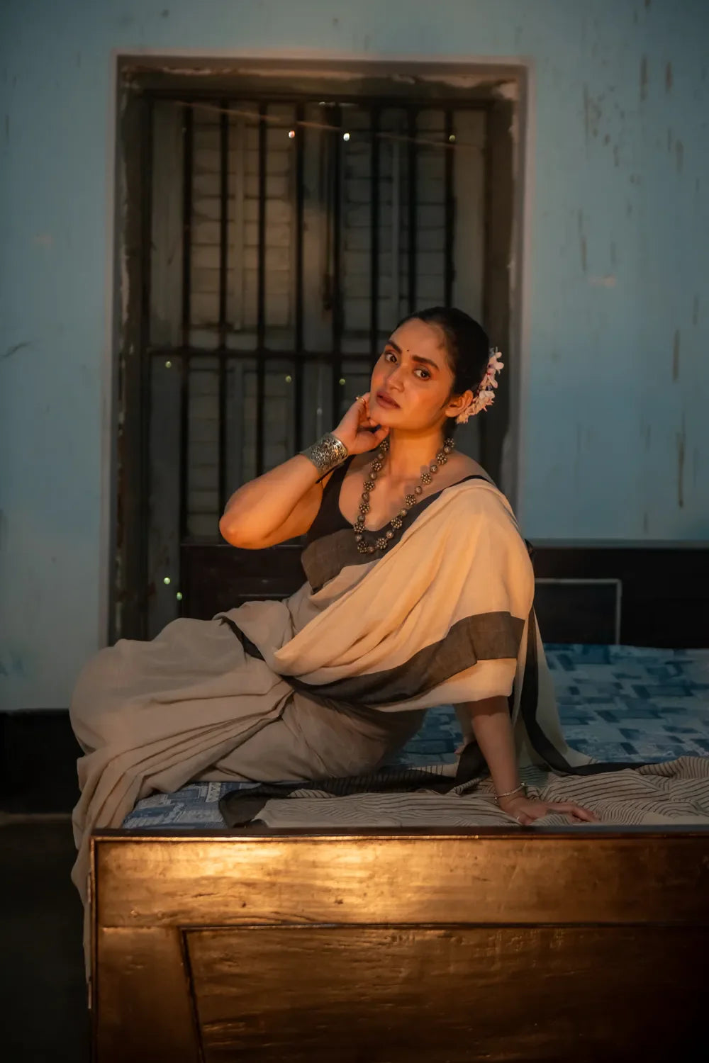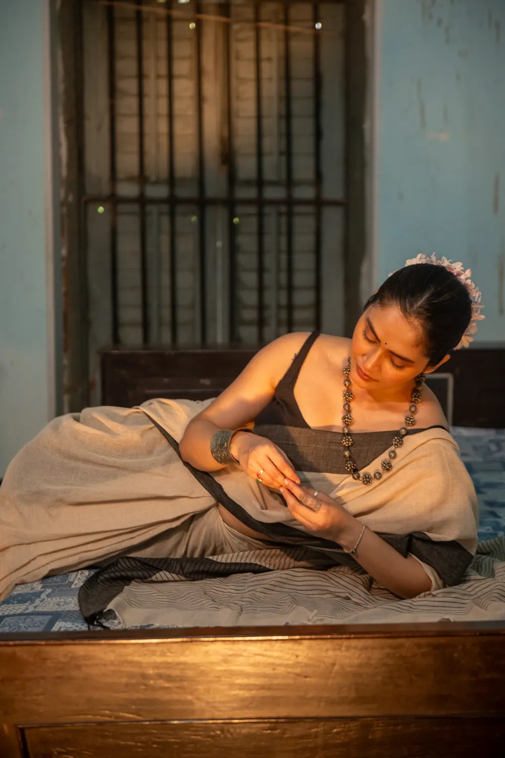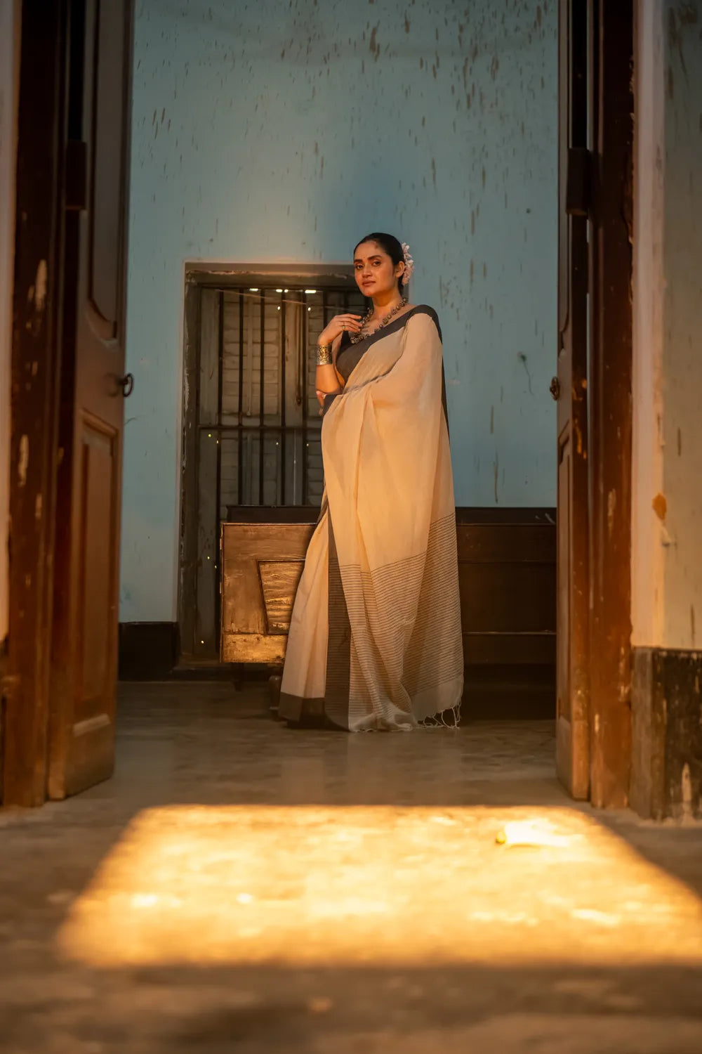 Handloom Beige Pure Cotton Saree with Dark Grey Border