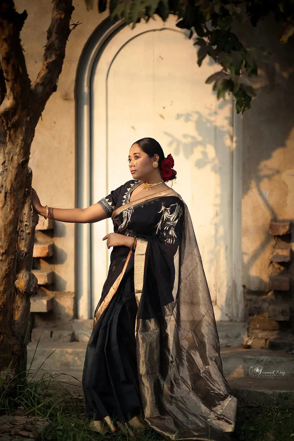 Handloom Black Chanderi Pure Silk Saree With Gold Zari Motifs
