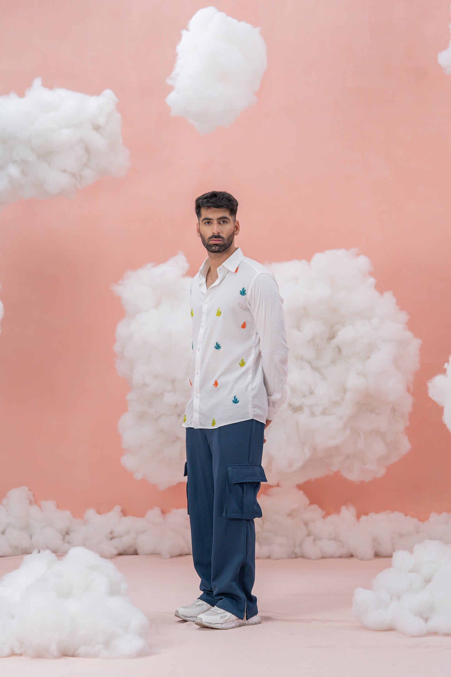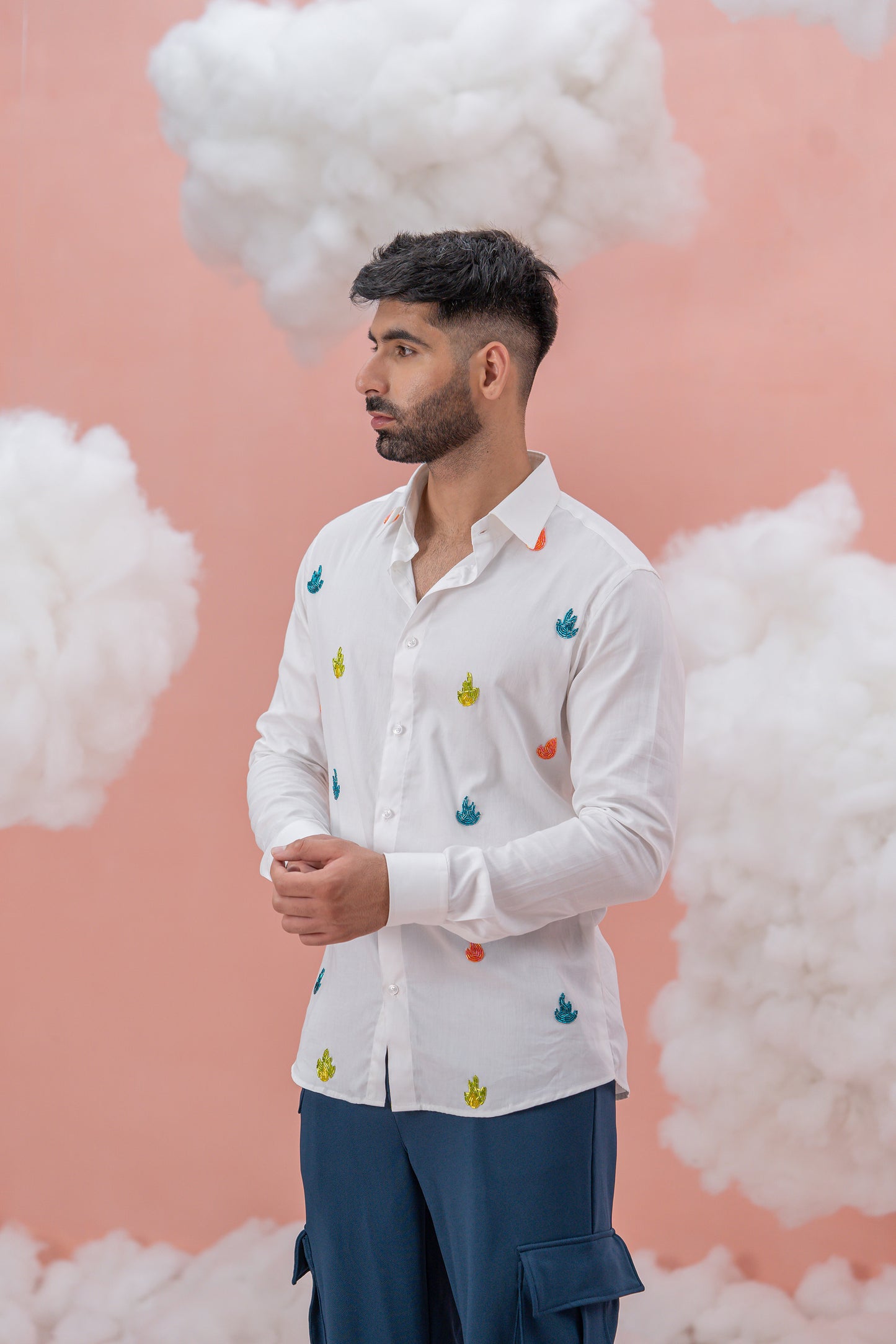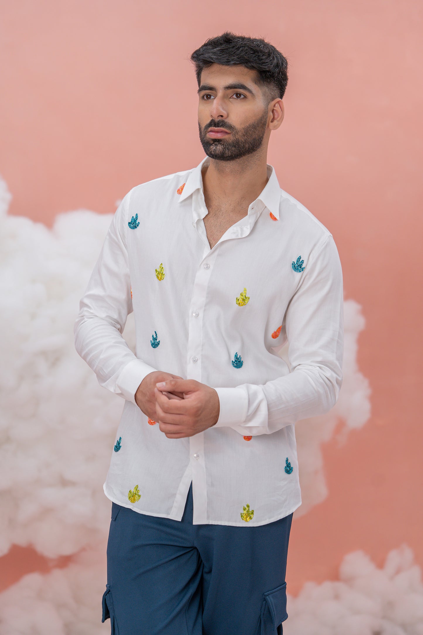 A hand-embroidered White Vegan Silk shirt, adorned with shiny cut pipe embedding vibrant flames. This striking design merges the raw power of ambition with the elegance of refined craftsmanship. Perfect for those who wear their ambition boldly, this shirt is a powerful expression of exceptional strength.