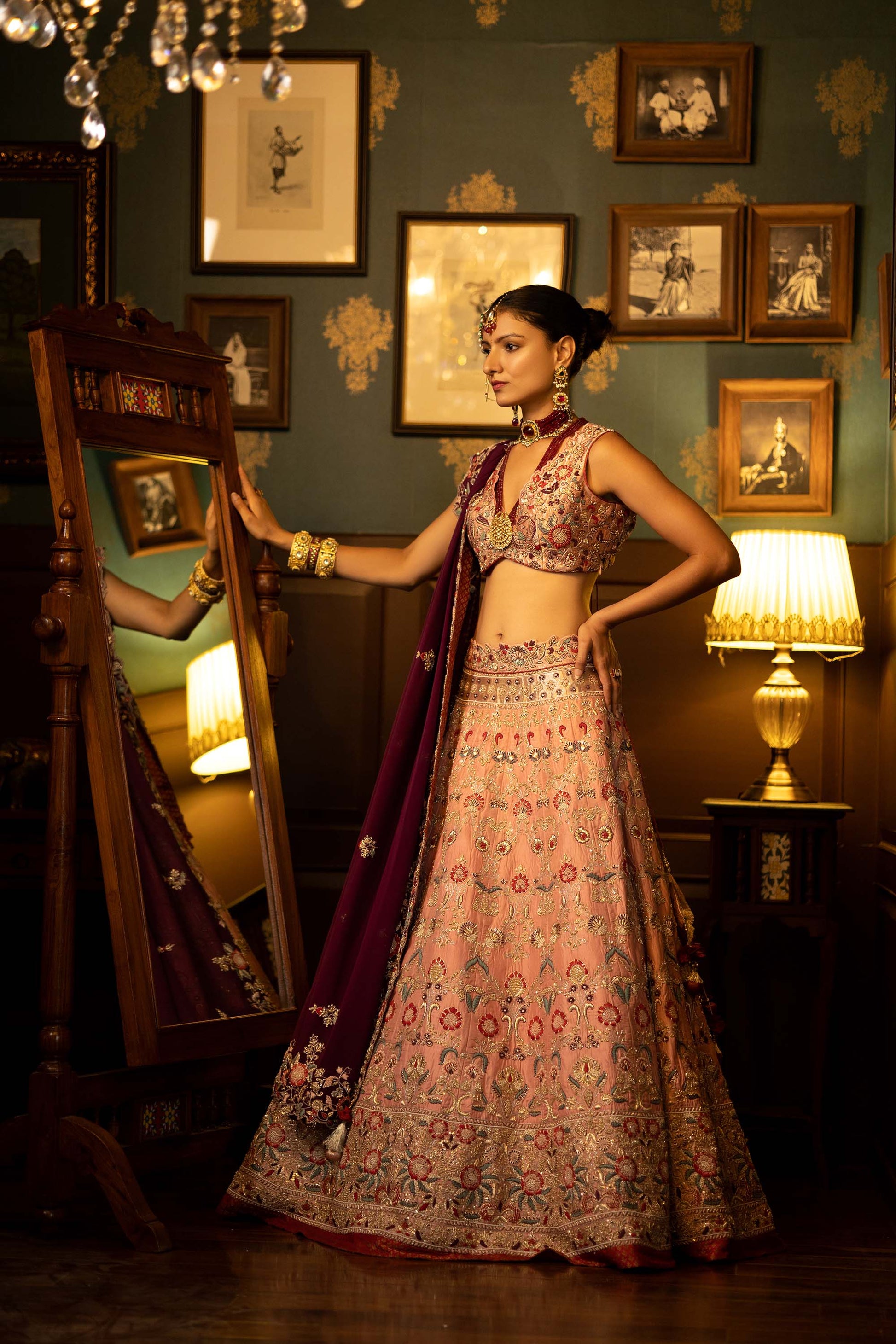 House of Supriya Pink Brocade Silk Hand Embroidered Bridal Lehenga