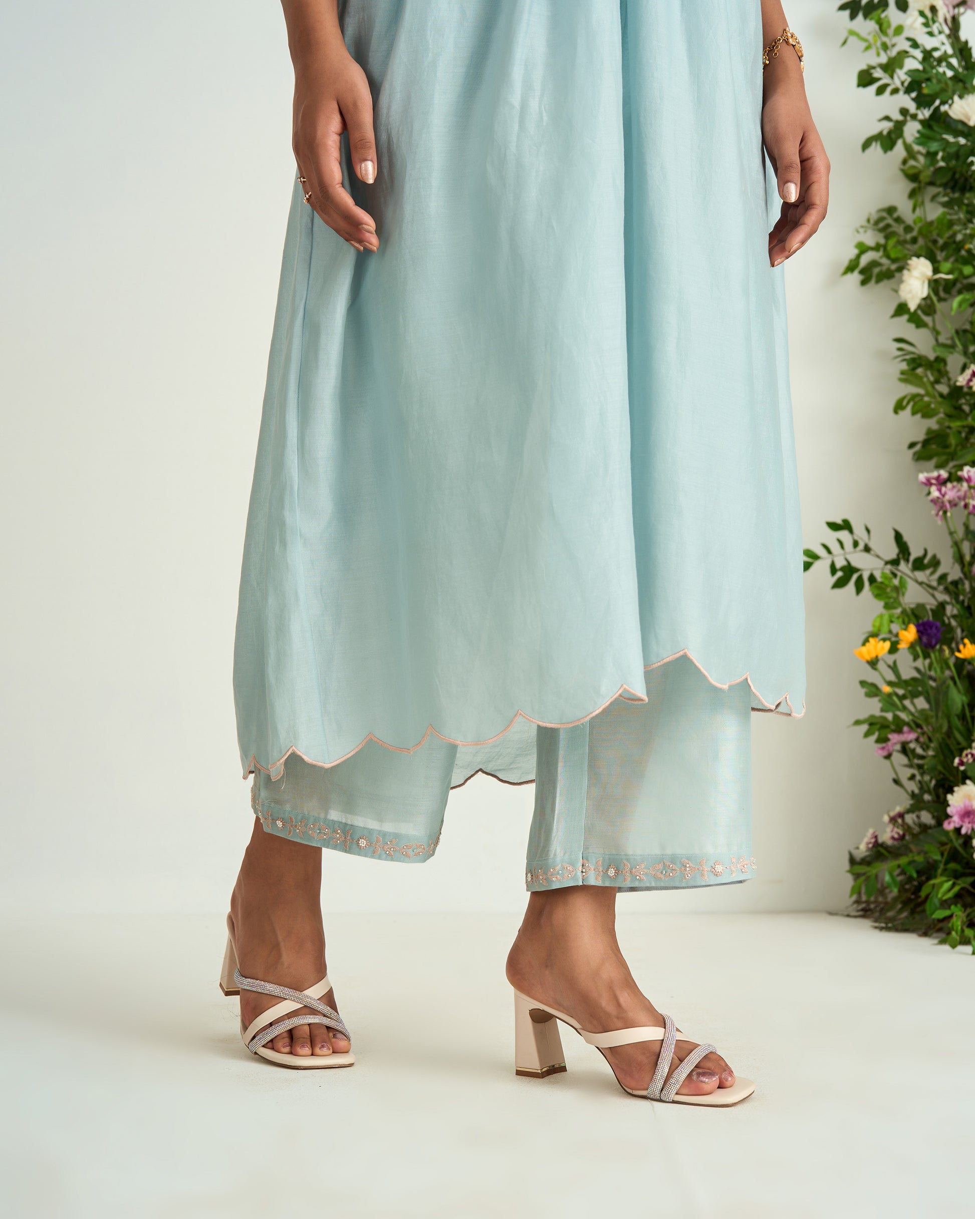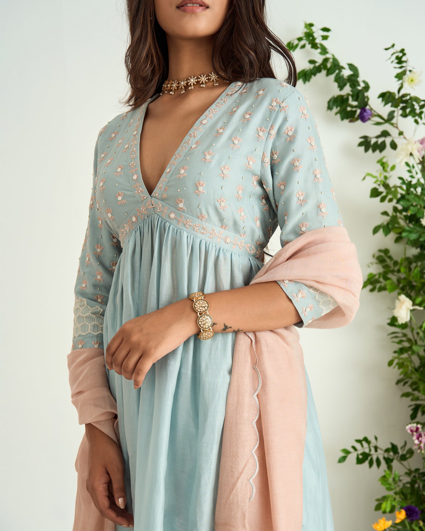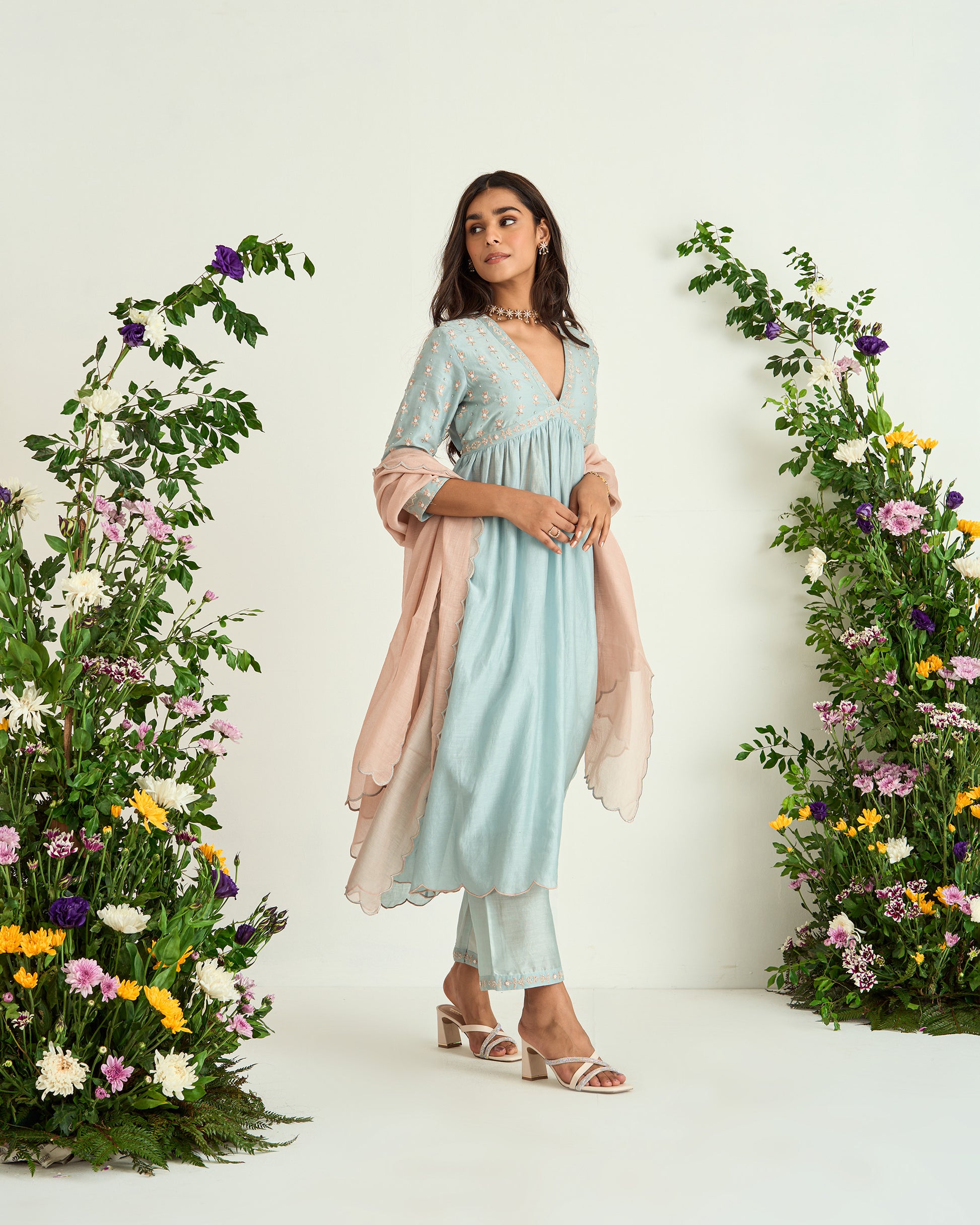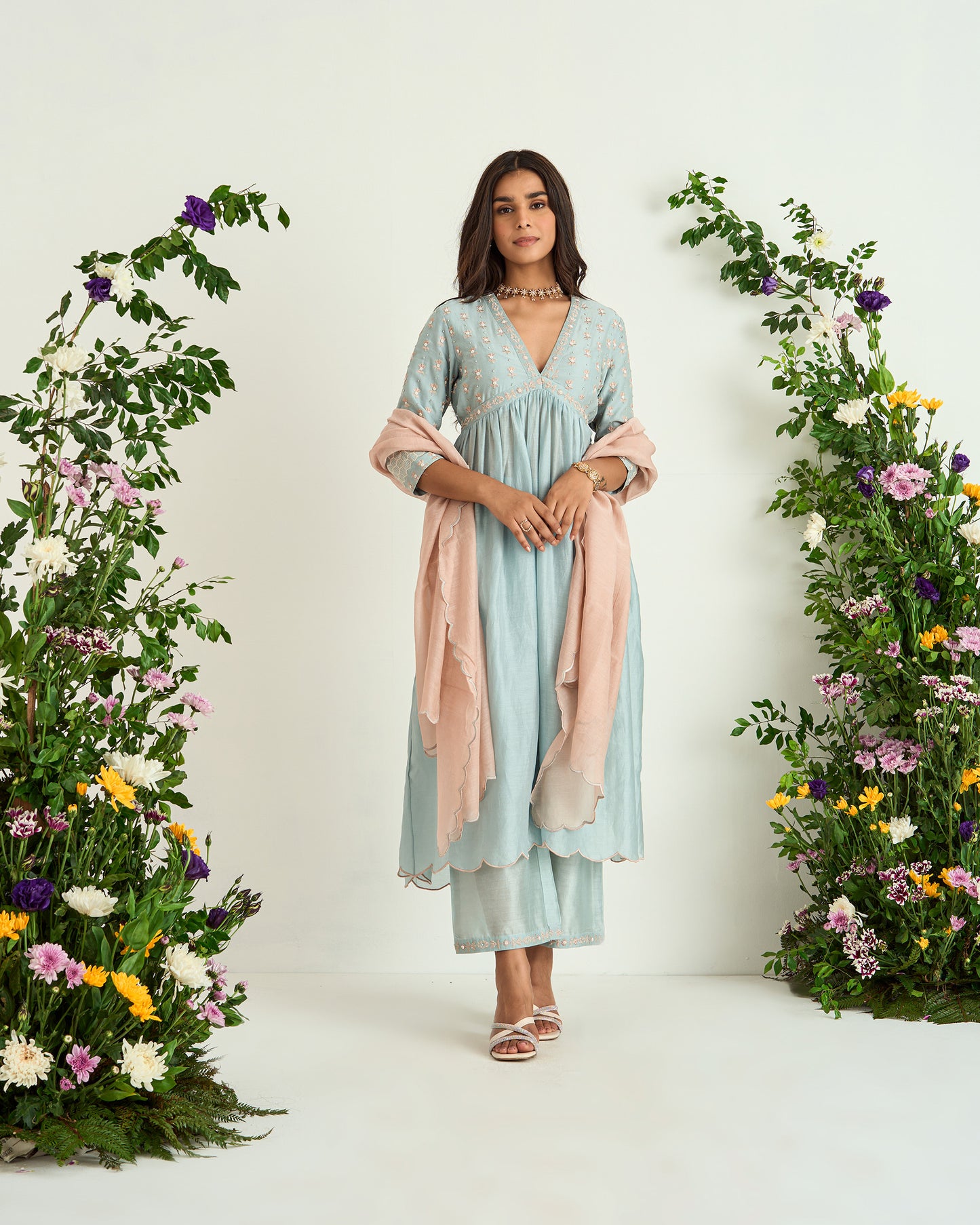 Ice Blue Embroidered Kurta Set - Featuring an ice blue kurta in silk chanderi base with resham and pearl embroidery. It is paired with matching pants and a contrasting beige dupatta.