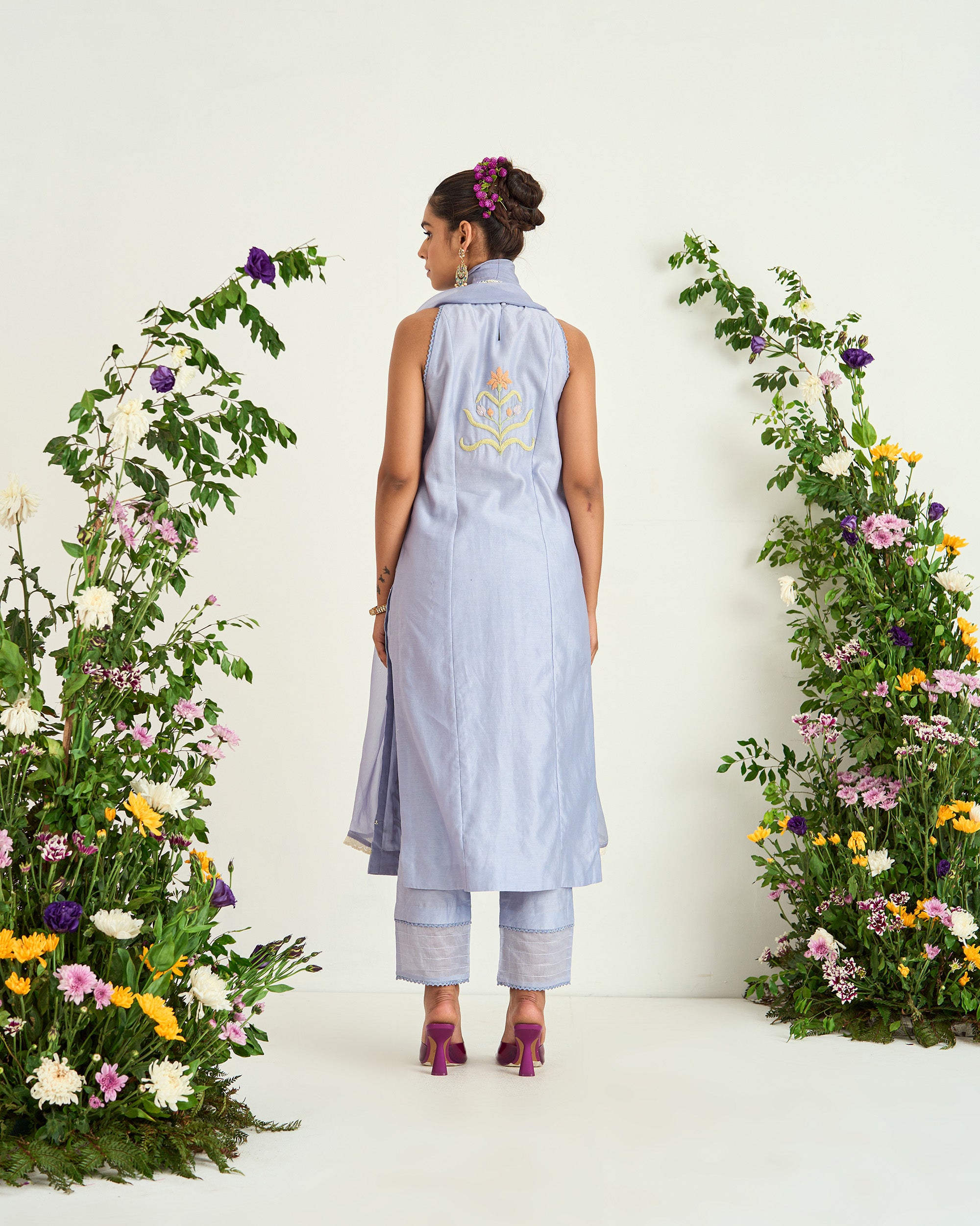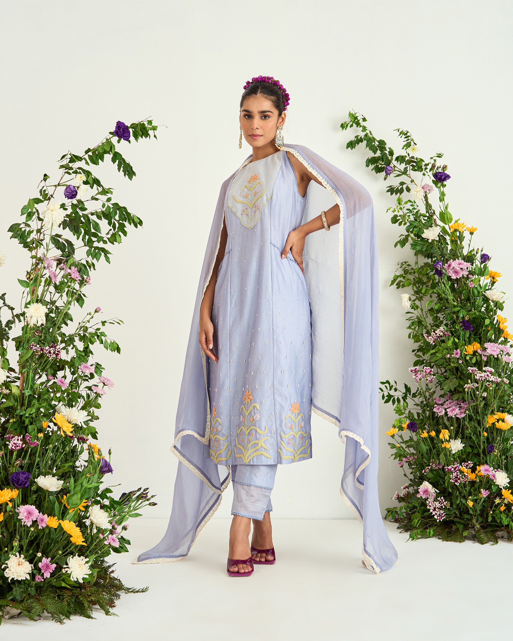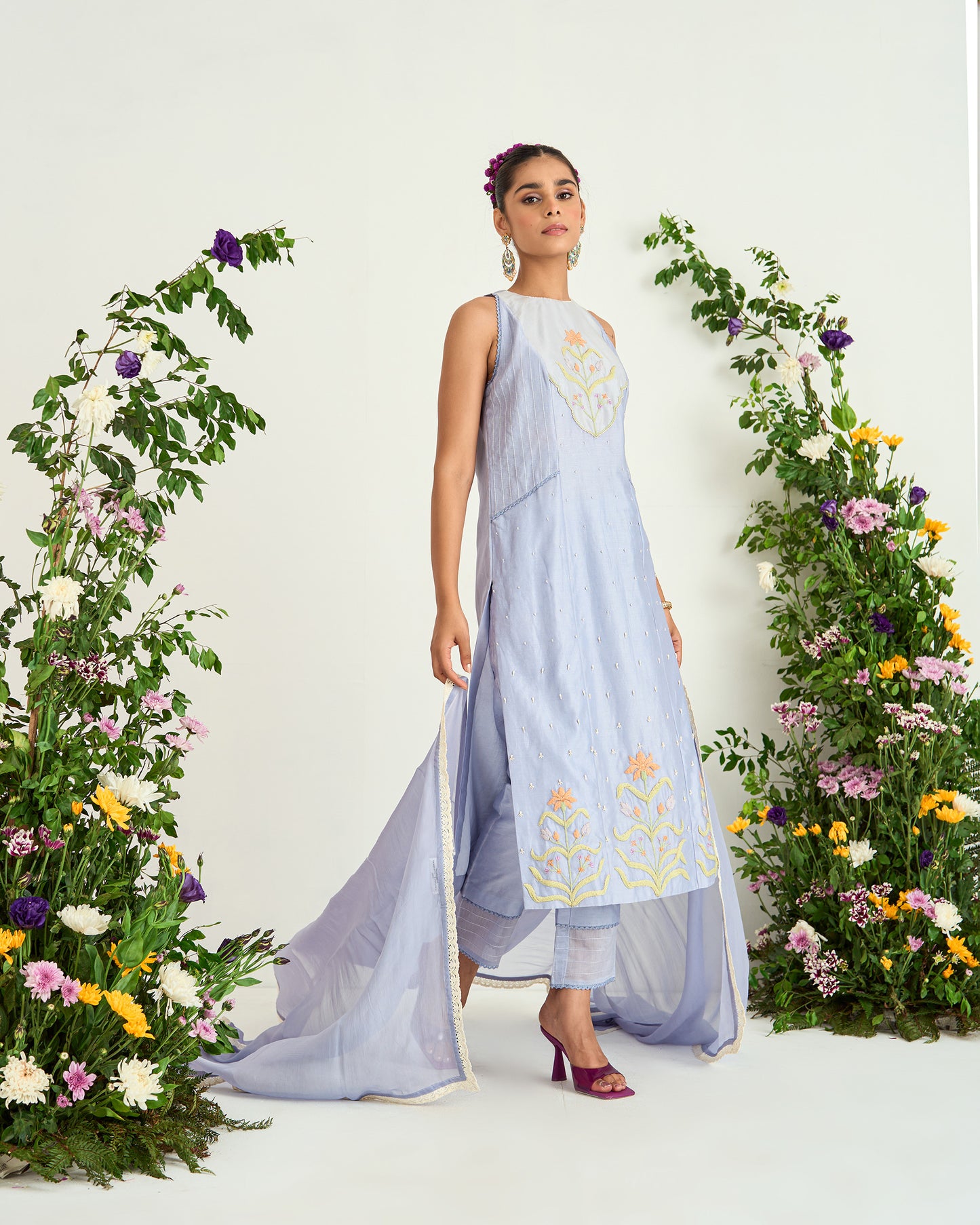 Ice Blue Dori Embroidered Kurta Set - Featuring an ice blue kurta in silk chanderi base with dori embroidery, badla and pearl embellishments. It is paired with matching pants and an organza dupatta.