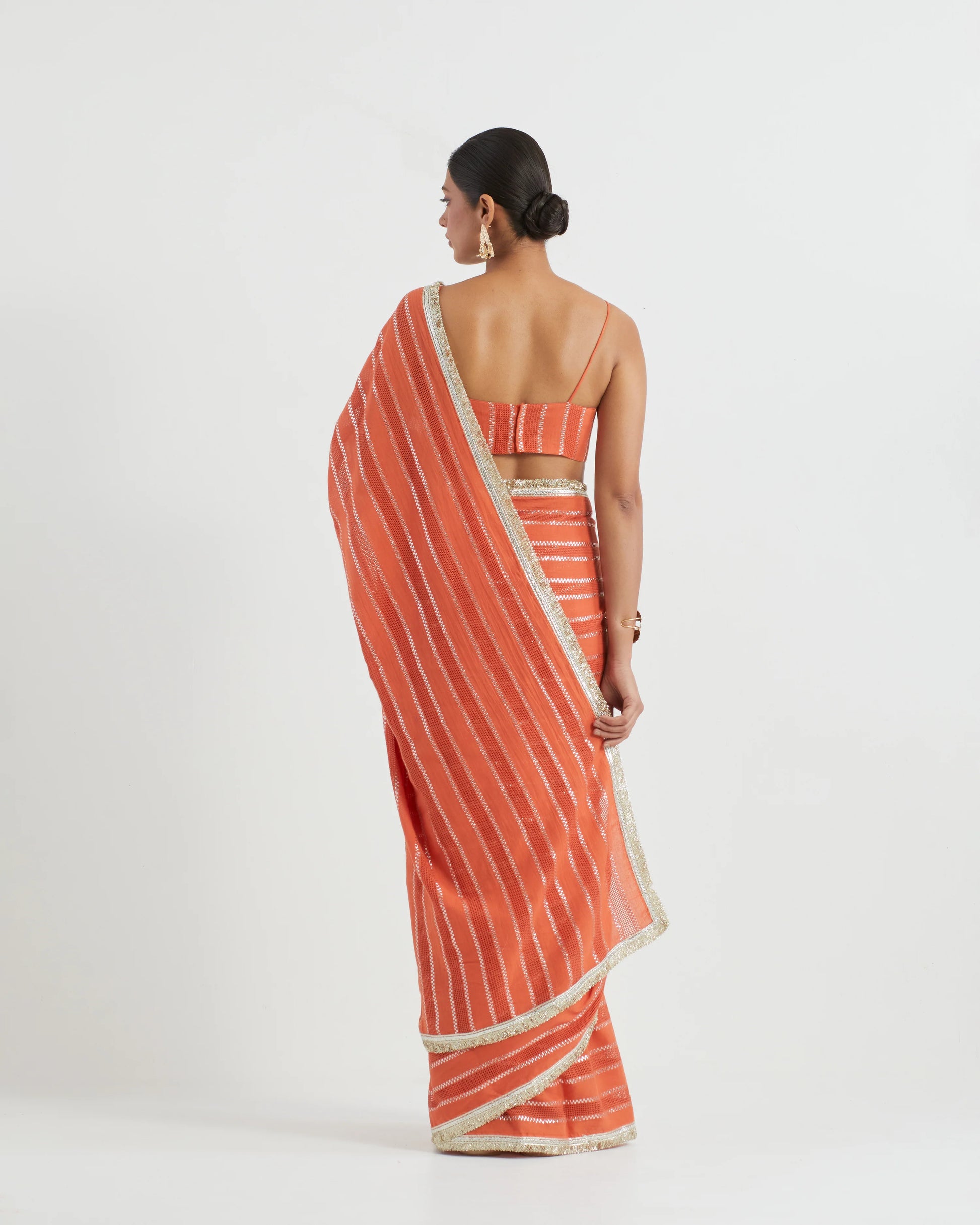 This saree is in cotton fabric with silver zari weave in it. Saree has silver fur gotta border to enhance the look.
