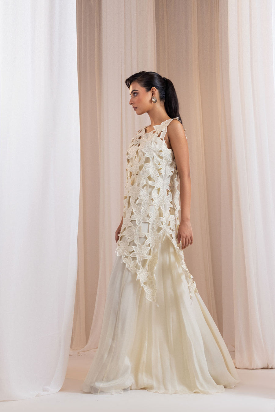 A three-piece ensemble featuring a sculpted bustier, flowy palazzo pants, and a sharply structured asymmetrical organza overlay. Intricate ivory floral cutwork with delicate bead detailing adds texture and dimension. The tonal ivory palette keeps the look refined and pristine. A play of structure and softness, it’s tailored for modern, high-end elegance.