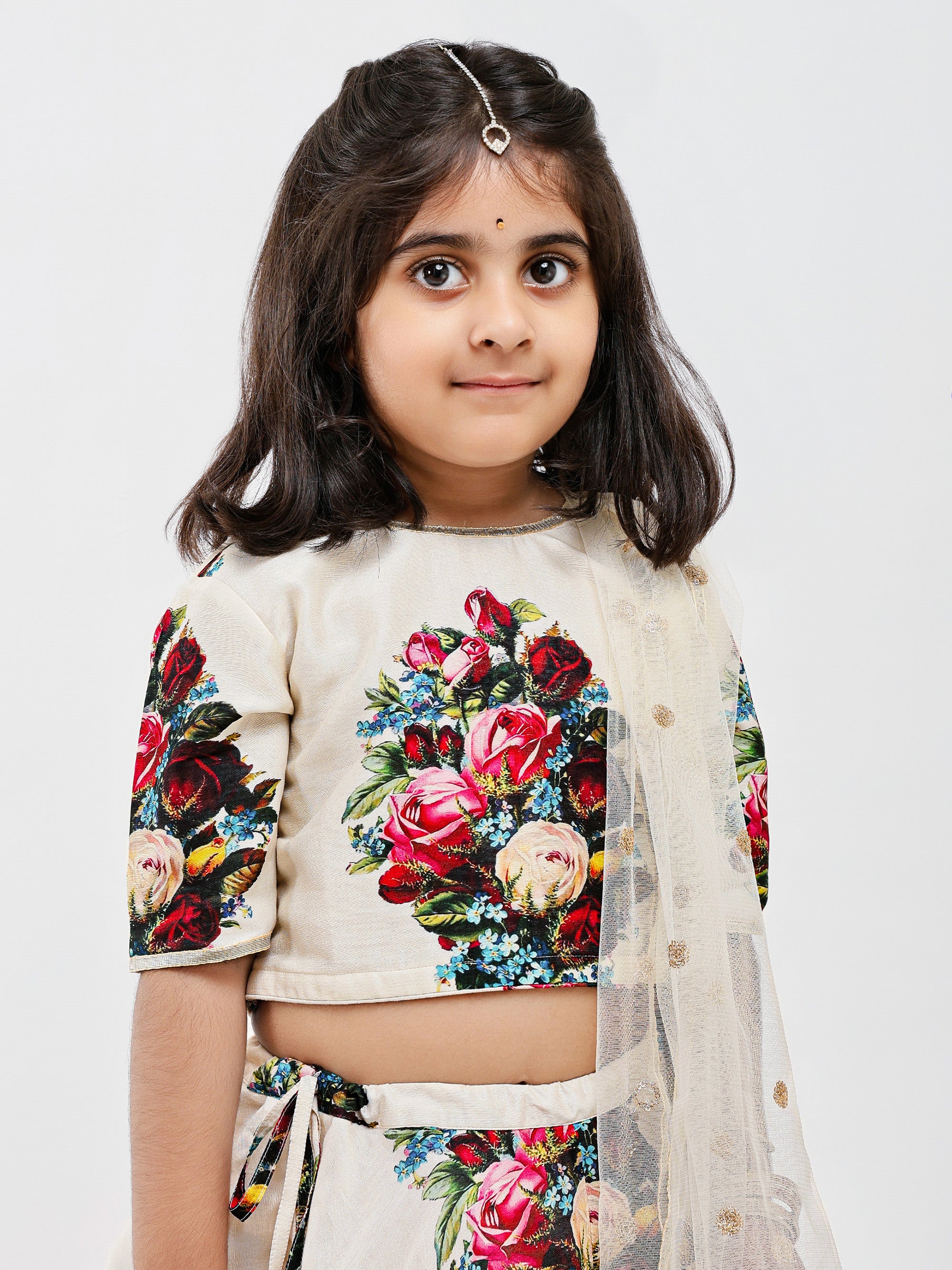 Ivory lehenga in handwoven chanderi and cotton lining with floral print attached with can-can. It is paired with a matching blouse and a net dupatta.